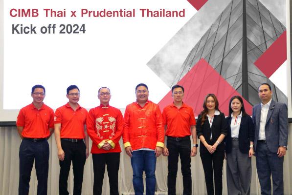 นายดอน จรรย์ศุภรินทร์ (ที่ 4 จากซ้าย) ประธานเจ้าหน้าที่บริหาร สายงานการพาณิชย์ บริษัท พรูเด็นเชียล ประกันชีวิต (ประเทศไทย) จำกัด (มหาชน) หรือ พรูเด็นเชียล ประเทศไทย ร่วมกับ นายตัน คีท จิน (ที่ 3 จากซ้าย) รองกรรมการผู้จัดการใหญ่ ธุรกิจรายย่อย และนายสุวดิศ ดิสถาพร (ที่ 4 จากขวา) ผู้ช่วยกรรมการผู้จัดการใหญ่ บริหารช่องทางการขายธุรกิจรายย่อย ธนาคาร ซีไอเอ็มบี ไทย จำกัด (มหาชน) จัดงาน “CIMB Thailand x Prudential Thailand Kick off 2024” ภายใต้แนวคิด One Team One Goal นำทีมผู้บริหารทั้ง 2 บริษัท ประกาศเป้าหมาย พร้อมเดินเกมเชิงรุกขับเคลื่อนธุรกิจแบงก์แอสชัวรันส์ในปีนี้ ภายในงานพรูเด็นเชียลฯได้มีการอบรมผลิตภัณฑ์ประกันชีวิตและโซลูชันด้านการประกันต่างๆที่ตอบโจทย์การใช้ชีวิต รวมถึงการสร้างความมั่งคั่ง ให้แก่พนักงานธนาคารซีไอเอ็มบี ไทย หลังจับมือเป็นพันธมิตรเพื่อขยายธุรกิจแบงก์แอสชัวรันส์ในประเทศไทย เมื่อเร็วๆนี้