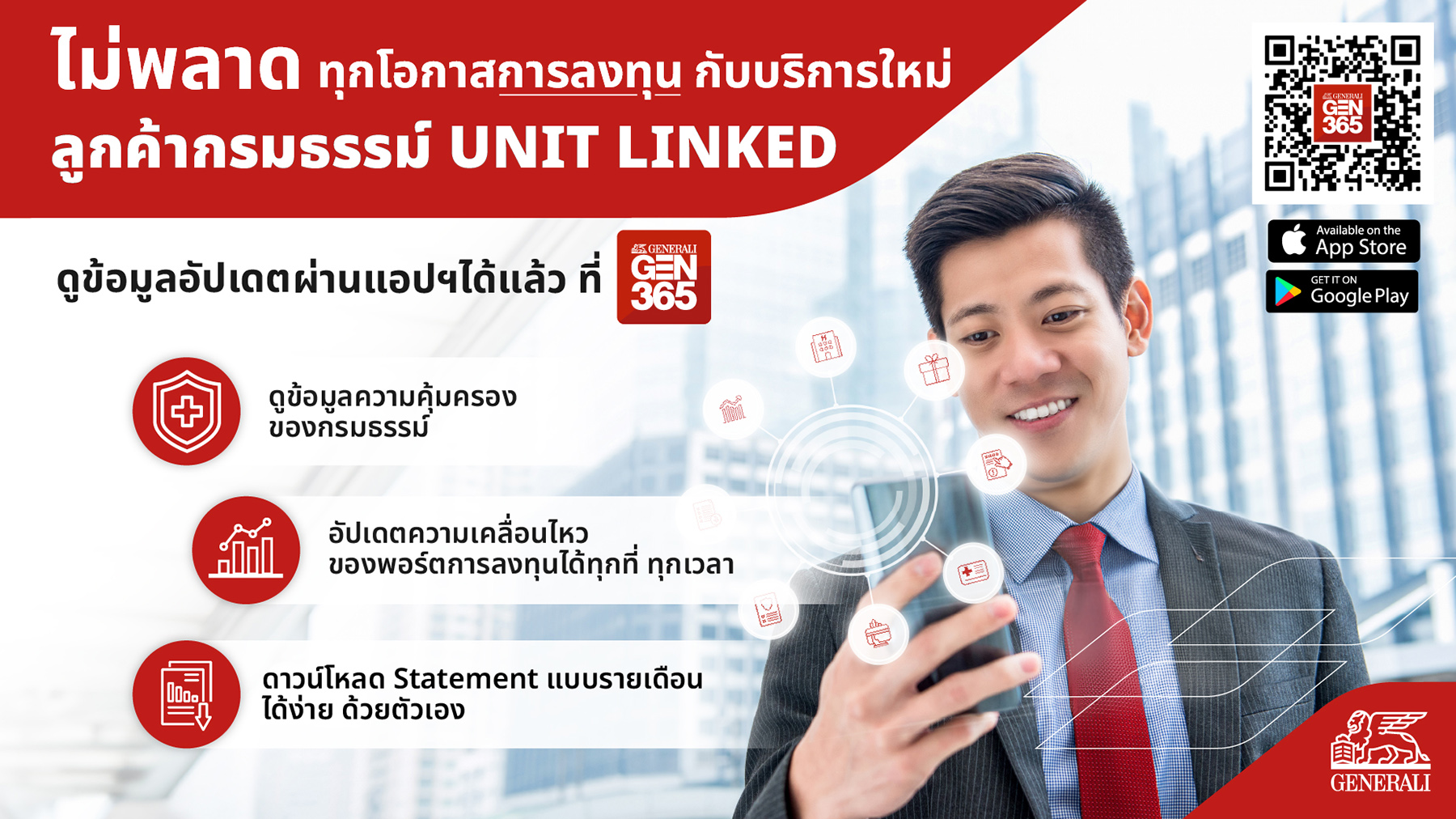 เจนเนอราลี่ ไทยแลนด์ เพิ่มบริการใหม่บนแอปพลิเคชัน GEN 365 ตอบโจทย์การใช้งานสำหรับลูกค้าผู้ถือกรมธรรม์ประกันชีวิตควบการลงทุน (Unit linked) ของเจนเนอราลี่ ไทยแลนด์ นอกจากจะ ดูข้อมูลความคุ้มครอง ผ่านแอปได้แล้ว ยังสามารถ “ตรวจสอบข้อมูลการลงทุน” ได้ด้วยตัวเอง ทั้งการดูข้อมูลภาพรวมกองทุนที่เลือก สถานะกองทุน ตรวจสอบมูลค่ารับซื้อ เช็กมูลค่ากองทุนในอดีตและผลตอบแทนล่าสุด ตรวจสอบรายละเอียดสัดส่วน หรือพอร์ตกองทุนที่เลือก อีกทั้งสามารถ “ดาวน์โหลดรายงานการลงทุน” ได้อย่างง่ายดาย หรือเลือกจัดส่งรายงานไปยังอีเมล ได้ตามความต้องการ โดยสามารถทำได้แล้วตั้งแต่วันนี้เป็นต้นไป ลูกค้ายูนิตลิงค์สามารถดูข้อมูลเพิ่มเติมได้ที่ https://generalimkt.page.link/GEN365-how-to-book