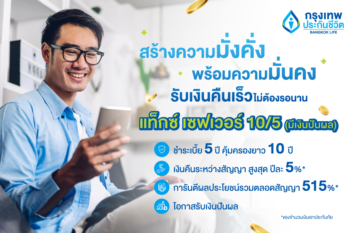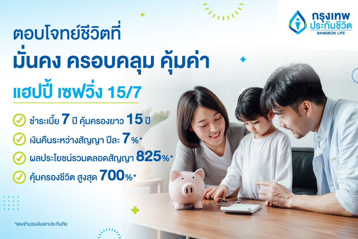 กรุงเทพประกันชีวิต แนะวางแผนการเงินด้วยแบบประกันที่ช่วยตอบโจทย์ชีวิตที่มั่นคง ทั้งความคุ้มครองที่ครอบคลุมและผลประโยชน์ที่คุ้มค่า พร้อมเปิดตัวแบบประกันสะสมทรัพย์ใหม่ 2 แบบ “แฮปปี้เซฟวิ่ง 15/7” ชำระเบี้ยเพียง 7 ปี แต่คุ้มครองยาวนาน 15 ปี มีเงินคืนระหว่างสัญญา ปีละ 7% ของจำนวนเงินเอาประกันภัย รวมผลประโยชน์ตลอดสัญญาทั้งสิ้น 825% ของจำนวนเงินเอาประกันภัย และ “แท็กซ์ เซฟเวอร์ 10/5 (มีเงินปันผล)” ชำระเบี้ยระยะสั้นเพียง 5 ปี คุ้มครอง 10 ปี การันตีผลประโยชน์รวมตลอดสัญญา 515% ของจำนวนเงินเอาประกันภัย และมีโอกาสรับเงินปันผลเพิ่ม ช่วยให้การวางแผนการใช้เงินระยะยาวบรรลุเป้าหมายด้วยผลตอบแทนตลอดสัญญา