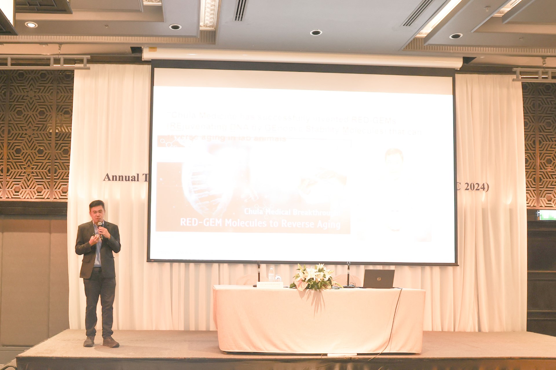 ผศ.ดร.นพ. อมรพันธ์ เสรีมาศพันธุ์ ผู้อำนวยการศูนย์นวัตกรรมทางการแพทย์ คณะแพทย์ศาสตร์จุฬาฯ หัวหน้าหน่วยปฏิบัติการนาโนชีวเวชศาสตร์ ภาควิชากายวิภาคศาสตร์ คณะแพทยศาสตร์ จุฬาฯ บรรยายวิชาการ เรื่อง “GENOMICS IN CANCER”