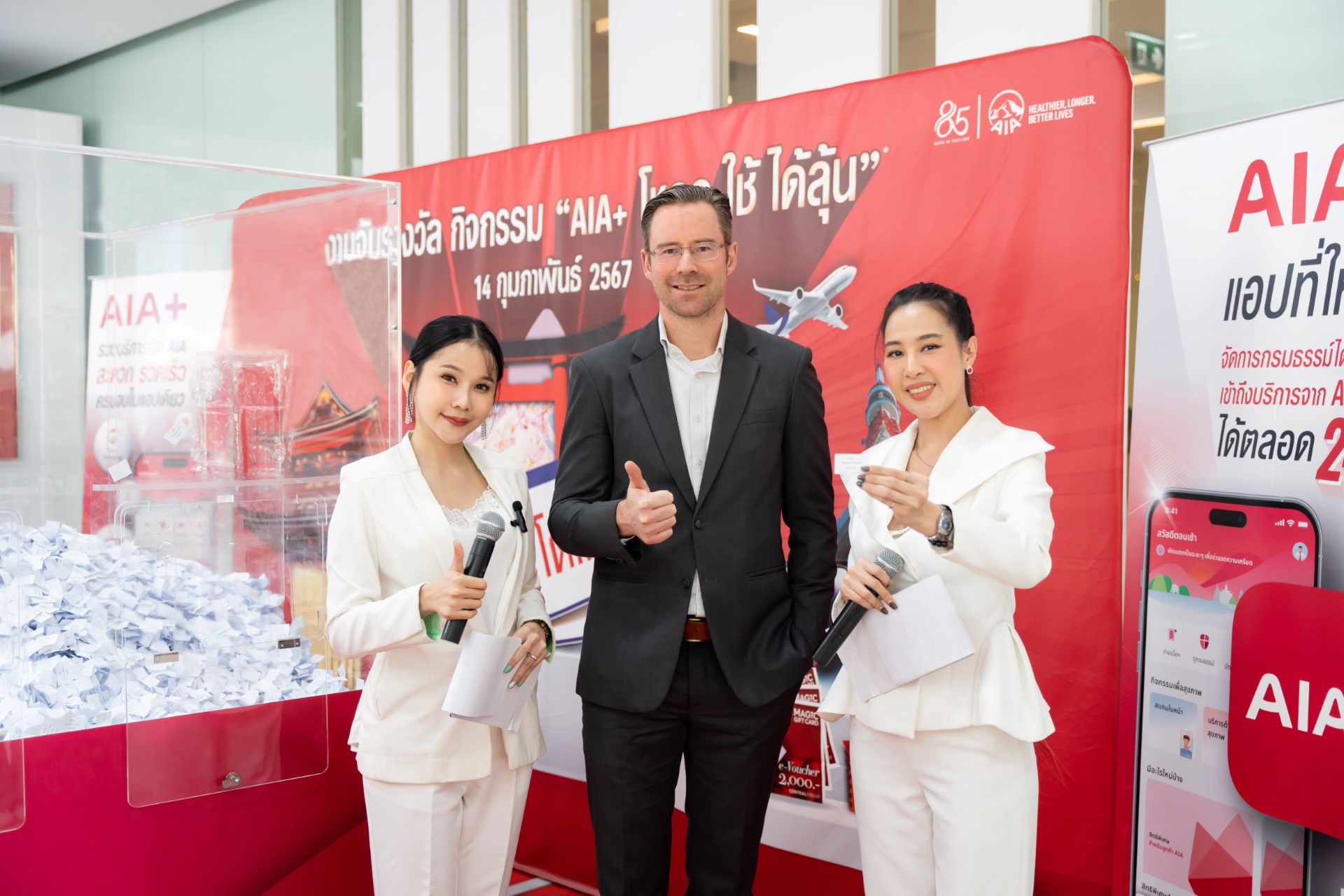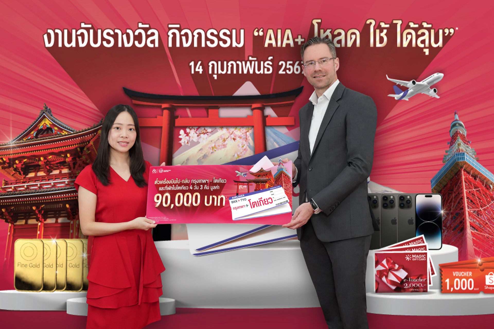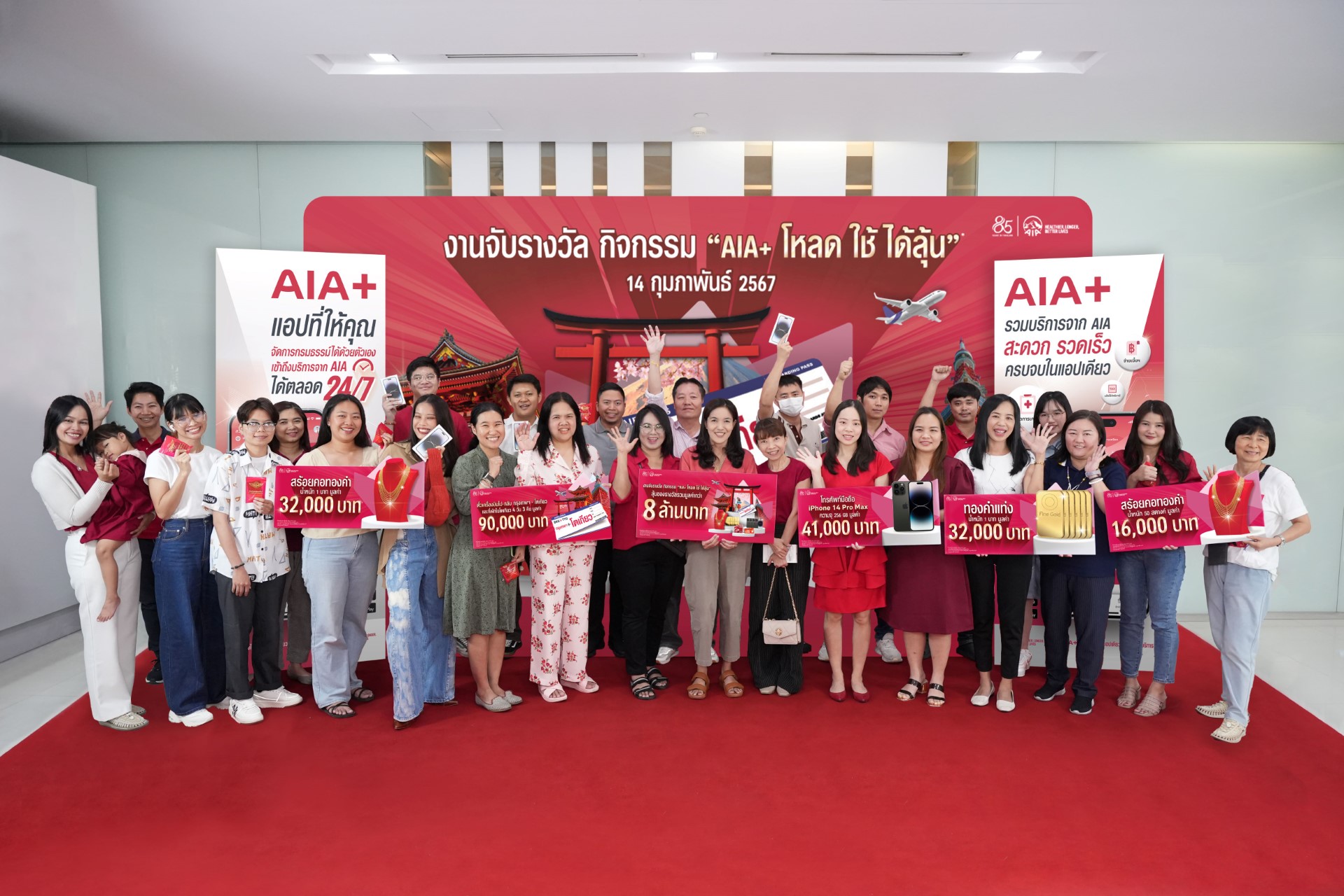 เอไอเอ พลัส (AIA+) จัดหนักจัดเต็ม ส่งความสุขให้ลูกค้าที่ถือกรมธรรม์ของ เอไอเอ ประเทศไทย* ที่ใช้แอปพลิเคชัน AIA+ ให้ได้มีสุขภาพดี พร้อมลุ้นรางวัลใหญ่กับกิจกรรม “เอไอเอ พลัส โหลด-ใช้-ได้ลุ้น โดยได้ทำการจับรางวัลผู้โชคดี เมื่อวันที่ 14 กุมภาพันธ์ 2567 ที่ผ่านมา นำโดย ดร. คริสเตียน โรแลนด์ ประธานเจ้าหน้าที่ฝ่ายกลยุทธ์และดิจิทัล เอไอเอ ประเทศไทย และนางอลิสา สิมะโรจน์ ประธานเจ้าหน้าที่ฝ่ายปฏิบัติการ เอไอเอ ประเทศไทย ซึ่งร่วมเป็นเกียรติในพิธีมอบรางวัลแก่ผู้โชคดีจำนวน 674 ท่านจากกิจกรรมดังกล่าว โดยประกอบด้วยรางวัลใหญ่ ได้แก่ ตั๋วเครื่องบินไป-กลับ กรุงเทพฯ-โตเกียว ประเทศญี่ปุ่น (พร้อมที่พัก) มูลค่ารวม 360,000 บาท iPhone14 Pro Max มูลค่ารวม 1,025,000 บาท ทองคำแท่งและสร้อยคอทองคำ มูลค่ารวม 640,000 บาท พร้อมรางวัลอื่น ๆ รวมอีกกว่า 600 รางวัล รวมมูลค่าทั้งสิ้นกว่า 8 ล้านบาท