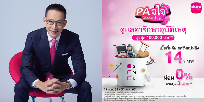 นายสาระ ล่ำซำ ประธานเจ้าหน้าที่บริหาร บริษัท เมืองไทยประกันชีวิต จำกัด (มหาชน) หรือ MTL เปิดเผยว่า เพื่อตอกย้ำนโยบาย “Happiness, Your Way เพราะความสุขคือทุกอย่าง…ความสุขสไตล์คุณคือที่สุดของทุกสิ่ง” ในฐานะคู่คิดด้านการวางแผนชีวิตและสุขภาพที่คุณวางใจ (No. 1 Most Trusted Partner in Life & Health Planning) และสร้างความสุขและรอยยิ้มที่ยั่งยืนให้กับผู้มีส่วนเกี่ยวข้องทุกฝ่าย ล่าสุด เมืองไทยประกันชีวิต ยังคงเดินหน้ารุกตลาดประกันออนไลน์อย่างต่อเนื่อง พร้อมเปิดประสบการณ์ใหม่ ของประกันอุบัติเหตุออนไลน์ ด้วยการเปิดตัว “PA จุใจ ไม่เคลมมีคืน” เติมความมั่นใจรับมืออุบัติเหตุ หากไม่เคลมก็ได้คืน