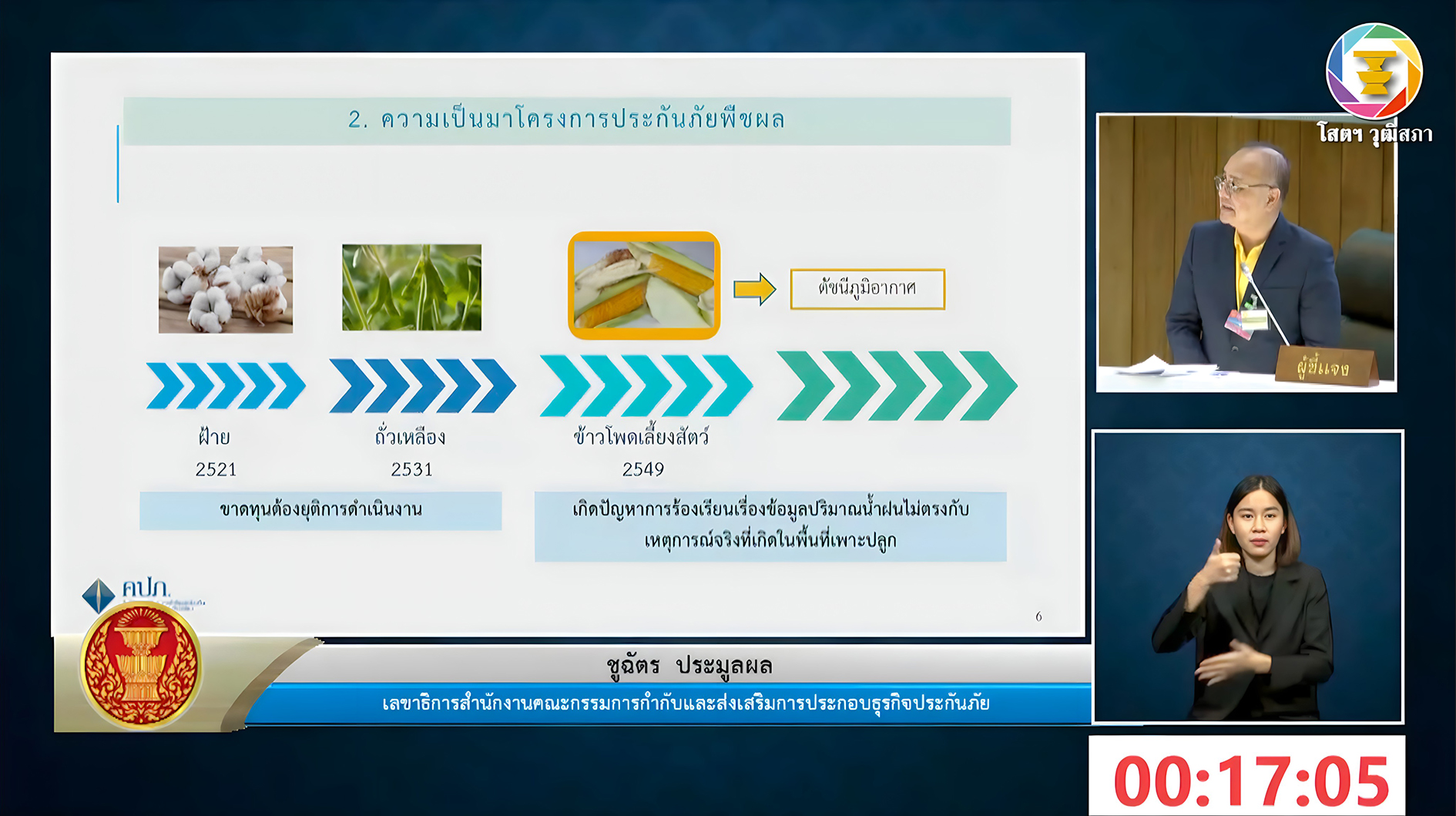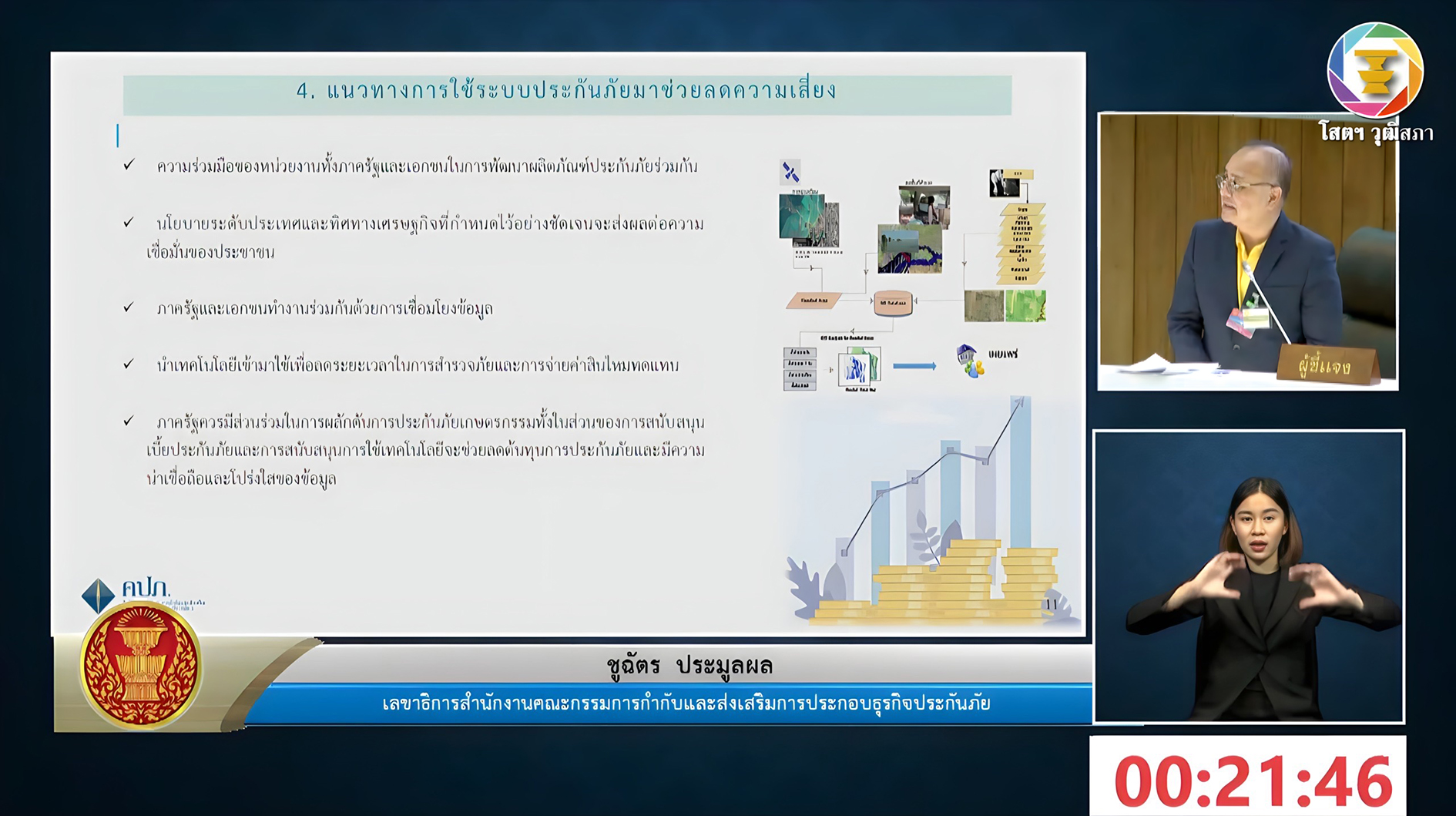 เลขาธิการ คปภ. กล่าวชี้แจงเกี่ยวกับบทบาทสำนักงาน คปภ. กับการประกันภัยเกษตรกรรม โดยมีใจความสำคัญตอนหนึ่งว่า สำนักงาน คปภ. มีหน้าที่กำกับและพัฒนาธุรกิจประกันภัยให้มีความแข็งแกร่ง มั่นคง เพื่อให้บริษัทประกันภัยมีความสามารถในการดำเนินธุรกิจและปฏิบัติตามสัญญาประกันภัย รวมถึงสนับสนุนธุรกิจประกันภัยให้มีบทบาทในการเสริมสร้างความแข็งแกร่งของระบบเศรษฐกิจและสังคมของประเทศเพื่อยกระดับคุณภาพชีวิตของประชาชนให้ดียิ่งขึ้น เช่น ส่งเสริมการพัฒนาผลิตภัณฑ์ประกันภัยใหม่ ๆ เพื่อตอบสนองความต้องการของประชาชน โดยกรมธรรม์และเบี้ยประกันภัยต้องได้รับการอนุมัติจากสำนักงาน คปภ. ตลอดจนการคุ้มครองสิทธิประโยชน์ของประชาชน โดยมีการจัดตั้งศูนย์ไกล่เกลี่ยข้อพิพาทด้านการประกันภัย รับเรื่องร้องเรียนผ่านทางสายด่วน คปภ. 1186 กำกับดูแลตัวแทนประกันภัยและนายหน้าประกันภัยเพื่อความโปร่งใสและให้ปฏิบัติตามกฎหมายอย่างเคร่งครัด