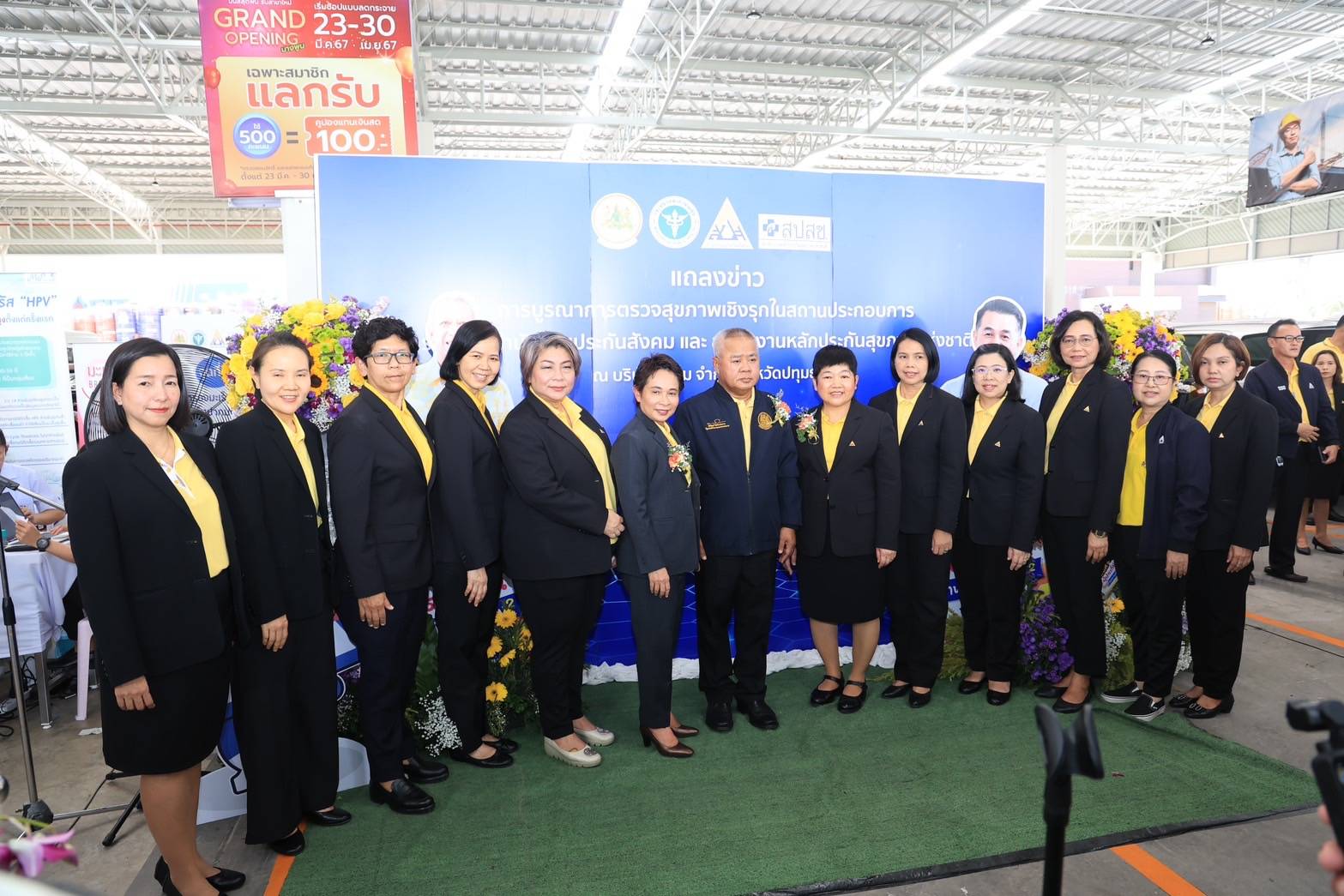 นายพิพัฒน์ รัชกิจประการ รัฐมนตรีว่าการกระทรวงแรงงาน พร้อมด้วย นายแพทย์ชลน่าน ศรีแก้ว รัฐมนตรีว่าการกระทรวงสาธารณสุข ตรวจเยี่ยมโครงการการตรวจสุขภาพเชิงรุกในสถานประกอบการ (KICK OFF) ระหว่าง สำนักงานประกันสังคมและสำนักงานหลักประกันสุขภาพแห่งชาติ ณ บริษัท ดูโฮม จำกัด (มหาชน) ตำบลบางพูน อำเภอเมืองปทุมธานี จังหวัดปทุมธานี โดยมีนายบุญสงค์ ทัพชัยยุทธ์ เลขาธิการสำนักงานประกันสังคม นายแพทย์จเด็จ ธรรมธัชอารี เลขาธิการสำนักงานหลักประกันสุขภาพแห่งชาติ ผู้บริหารกระทรวงแรงงาน ผู้บริหารสำนักงานประกันสังคม ผู้บริหารกระทรวงสาธารณสุข ผู้บริหารสำนักงานหลักประกันสุขภาพแห่งชาติ นายอดิศักดิ์ ตั้งมิตรประชา ประธานบริษัท ดูโฮม จำกัด (มหาชน) นายผยง ศรีพาณิช์ กรรมการผู้จัดการใหญ่ ธนาคารกรุงไทย จำกัด (มหาชน) คณะผู้บริหารโรงพยาบาลปทุมธานี คณะผู้บริหารดูโฮมฯ สื่อมวลชน และผู้เข้าร่วมงาน ให้การต้อนรับ