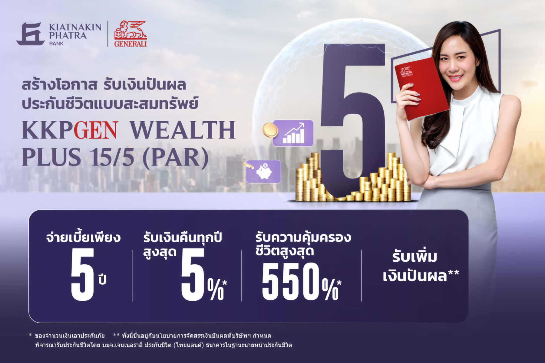 "เจนเนอราลี่ ประกันชีวิต ไทยแลนด์" ร่วมกับ “ธนาคารเกียรตินาคินภัทร จำกัด (มหาชน)” ออกประกันสะสมทรัพย์แบบมีเงินปันผล KKPGEN WEALTH PLUS 15/5 (PAR) ให้ผลประโยชน์สูงทั้งคุ้มครองชีวิต สะสมเงินออมในรูปแบบการประกันชีวิต และวางแผนภาษี