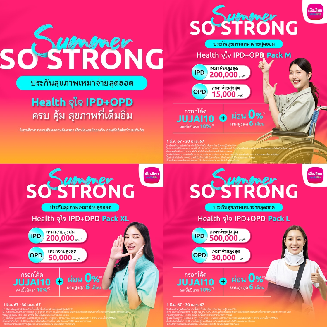 เมืองไทยประกันชีวิต ส่งประกันสุขภาพเหมาจ่ายสุดฮอต “Health จุใจ IPD+OPD” จัดแคมเปญ Summer So Strong ช่วยเพิ่มความอุ่นใจ หายห่วงเรื่องค่ารักษา พร้อมสิทธิพิเศษสุดคุ้มถึง 2 ต่อ เพียงกรอกโค้ด “JUJAI10” และเลือกผ่อนได้ 0% นานสูงสุดถึง 6 เดือน พร้อมรับความสุขและความอุ่นใจได้แล้วตั้งแต่ 1 มีนาคม - 30 เมษายน 2567