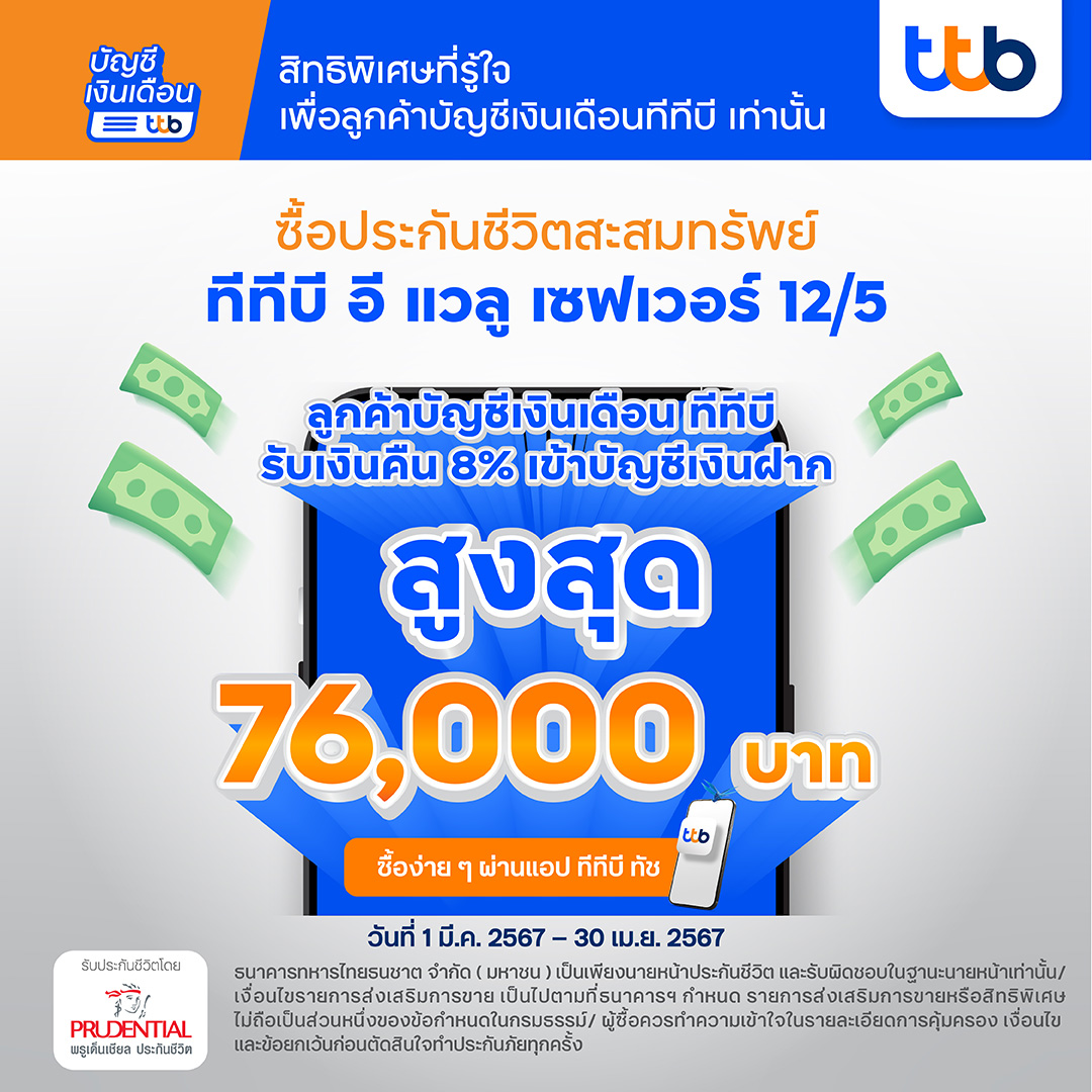 ทีเอ็มบีธนชาต หรือ ทีทีบี มอบสิทธิพิเศษเพื่อลูกค้าบัญชีเงินเดือน ทีทีบี ตอกย้ำการเป็นธนาคารที่มุ่งส่งเสริมให้พนักงานเงินเดือนมีชีวิตทางการเงินที่ดีขึ้นรอบด้าน และเพื่อตอบโจทย์ความคุ้มค่าที่ได้มากกว่าบัญชีเงินเดือนทั่วไป รับสิทธิ์สุดคุ้ม พิเศษ! สำหรับลูกค้าบัญชีเงินเดือน ทีทีบี รับเงินคืนเข้าบัญชีเงินฝากของทีทีบี 8% (ลูกค้าทั่วไป รับเงินคืน 6%) ของค่าเบี้ยประกันปีแรก สูงสุดถึง 76,000 บาท เพียงชำระค่าเบี้ยประกันชีวิตสะสมทรัพย์ ทีทีบี อี แวลู เซฟเวอร์ 12/5 แบบรายปี เฉพาะปีแรก ตั้งแต่ 30,000 บาท ขึ้นไป ผ่านแอป ทีทีบี ทัช ตั้งแต่วันนี้ – 30 เมษายน 2567