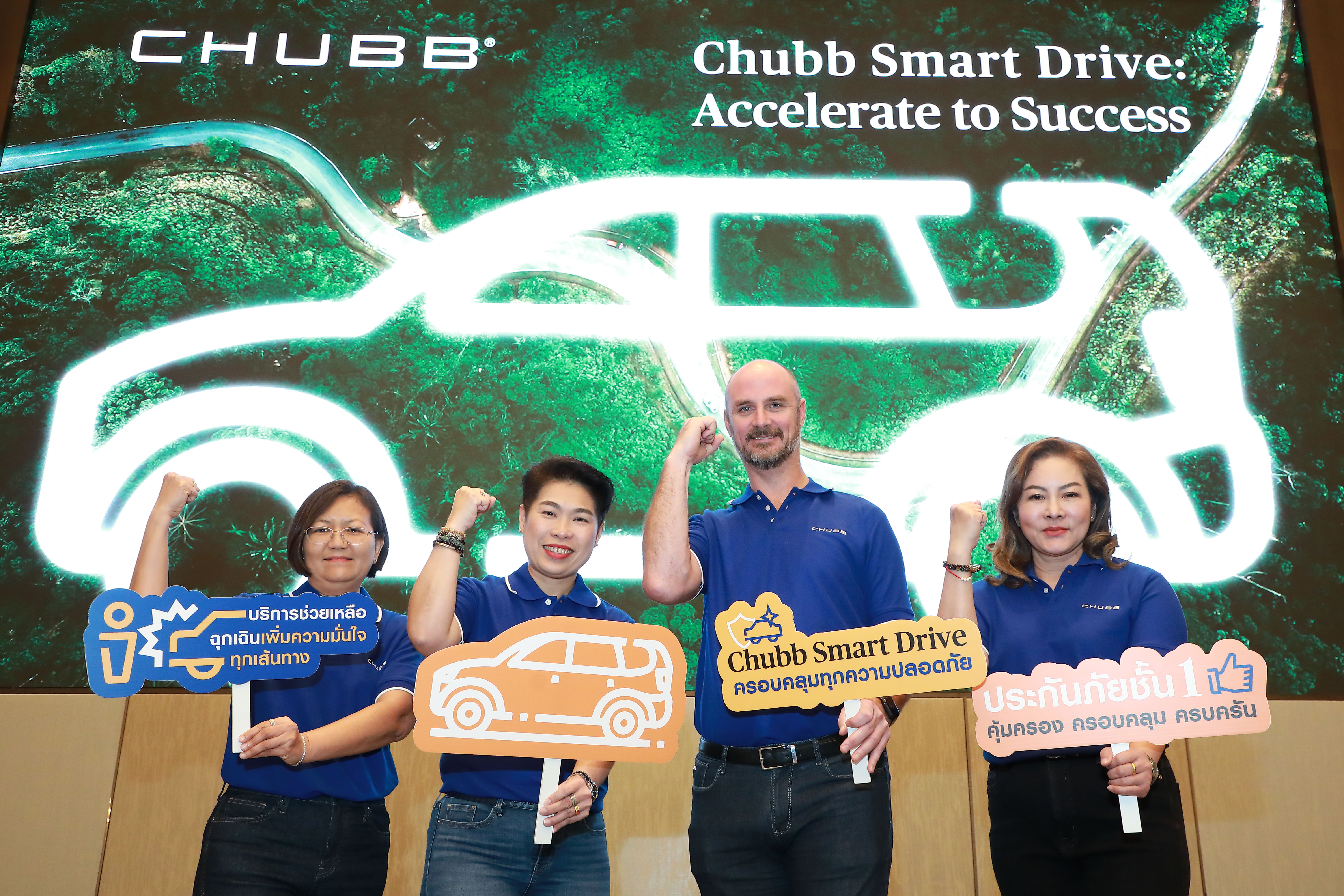 คุณแอนดรูว์ นิสเบ็ท ประธานเจ้าหน้าที่บริหาร (Country President) บริษัท ชับบ์สามัคคีประกันภัย จำกัด (มหาชน) (ที่ 3 จากซ้าย) และคุณหนึ่งฤทัย ฤทธิ์ธาอภินันท์ ประธานเจ้าหน้าที่บริหารช่องการจัดจำหน่ายผ่านธุรกิจคู่ค้า (ที่ 2 จากซ้าย) พร้อมด้วย คุณเพ็ญพิชชา จุลเจือ หัวหน้าสายงานผลิตภัณฑ์ประกันภัยสำหรับบุคคล (ที่ 4 จากซ้าย) และคุณวลี สุนทรวงศ์ หัวหน้าสายงานสินไหมทดแทน (ที่ 1 จากซ้าย) นำทีมผู้บริหาร จัดงาน “Chubb Smart Drive: Accelerate to Success” เปิดตัวผลิตภัณฑ์ประกันภัยรถยนต์ชั้น 1 แผนล่าสุด ชับบ์ สมาร์ท ไดร์ฟ (Chubb Smart Drive) ให้แก่นายหน้า และตัวแทนประกันวินาศภัย ทั้งนี้ กิจกรรมดังกล่าวจัดขึ้นเมื่อเร็วๆ นี้ ณ โรงแรมชาเทรียม แกรนด์ กรุงเทพฯ ถ. เพชรบุรี กรุงเทพฯ