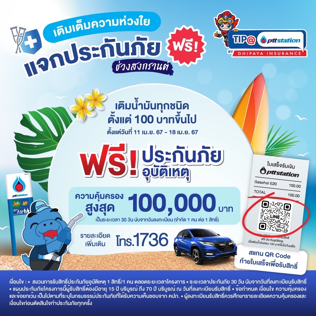คุณสุภาพ ประดับการ รองกรรมการผู้จัดการใหญ่ บริษัท ทิพยประกันภัย จำกัด (มหาชน) พร้อมด้วย คุณพิมาน พูลศรี รองประธานเจ้าหน้าที่บริหารด้านธุรกิจค้าปลีกน้ำมัน บริษัท ปตท.น้ำมันและการค้าปลีก จำกัด (มหาชน) หรือ OR ร่วมเติมเต็มความห่วงใยในการเดินทางช่วงเทศกาลสงกรานต์ ปี 2567 ให้กับลูกค้า พีทีที สเตชั่น เมื่อเติมน้ำมันชนิดใดก็ได้ ตั้งแต่ 100 บาทขึ้นไป/ใบเสร็จ สามารถ Scan QR Code ท้ายใบเสร็จ เพื่อลงทะเบียนรับสิทธิประกันภัยอุบัติเหตุ “สงกรานต์คลายร้อน” ฟรี ระหว่างวันที่ 11 เมษายน 2567 – 18 เมษายน 2567 โดยมีระยะเวลาความคุ้มครอง 30 วัน (นับจากวันที่ลงทะเบียน) และจะได้รับความคุ้มครองการเสียชีวิตจากอุบัติเหตุ ในวงเงินสูงสุดจำนวน 100,000 บาท และได้รับค่ารักษาพยาบาล เนื่องจากอุบัติเหตุ สูงสุด 5,000 บาท (ตามเงื่อนไขที่บริษัทฯ กำหนด)