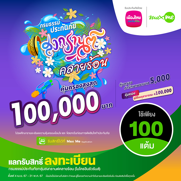 โดย “กรมธรรม์ประกันภัยกลุ่มสงกรานต์คลายร้อน (ไมโครอินชัวรันส์)” มีระยะเวลาคุ้มครอง 30 วัน นับจากวันเริ่มต้นระยะเวลาเอาประกันภัย ซึ่งผู้ที่จะได้รับสิทธิ์จะต้องถือสัญชาติไทยเท่านั้น และมีอายุตั้งแต่ 15 ปีบริบูรณ์ ถึง 70 ปีบริบูรณ์ ณ วันที่ทำประกันภัย โดยสมาชิก Max Card ที่สนใจสามารถแลกคะแนนได้ตั้งแต่วันที่ 4 เมษายน – 31 พฤษภาคม 2567 (จำนวนสิทธิ์ 5,000 สิทธิ์)