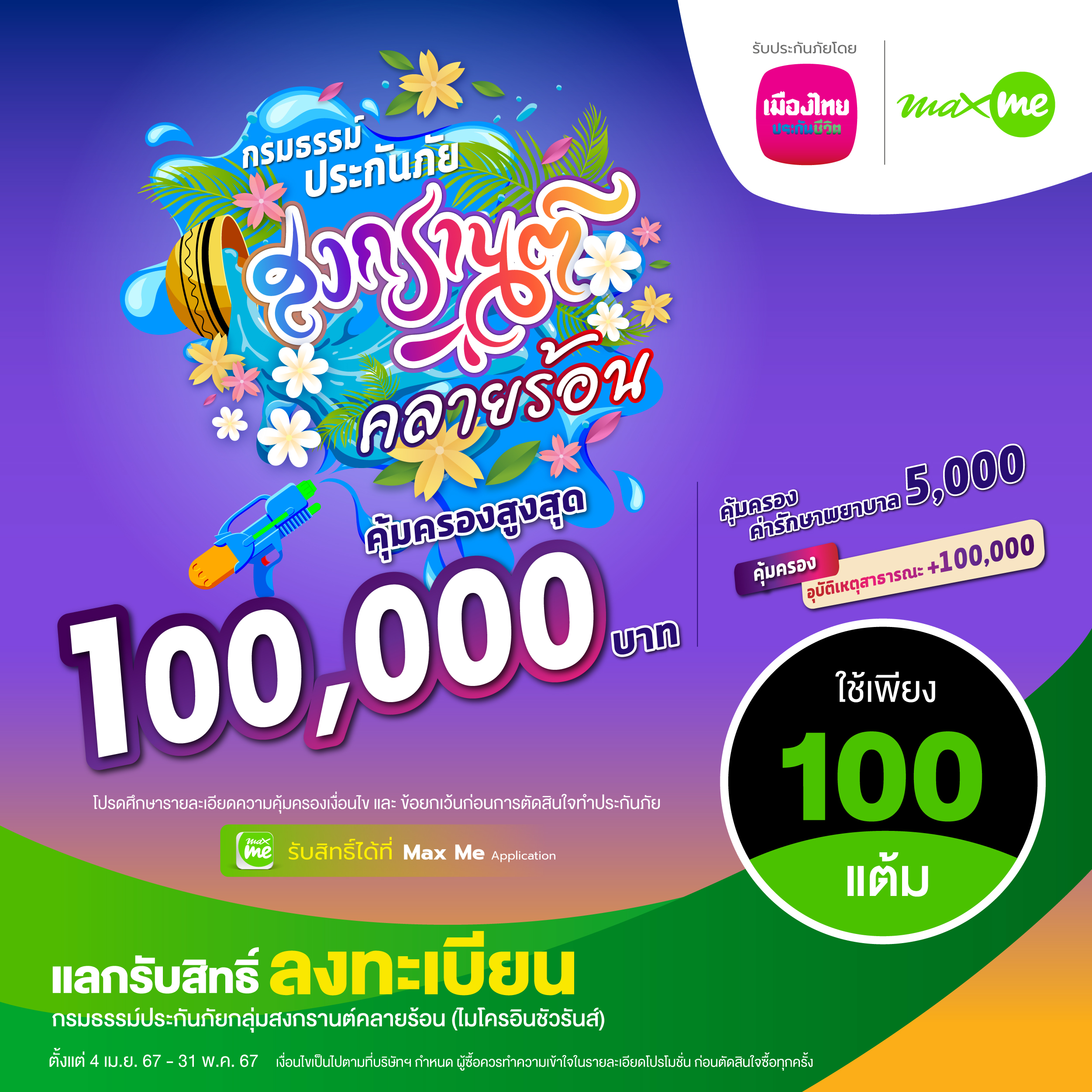 • สมาชิก Max Card ใช้ 100 คะแนน รับสิทธิ์ลงทะเบียนกรมธรรม์ประกันภัยกลุ่มสงกรานต์คลายร้อน (ไมโครอินชัวรันส์) ผ่านแอปพลิเคชัน Max Me (ไม่จำกัดสิทธิ์ / สมาชิก ซึ่งผู้รับความคุ้มครองต้องไม่ใช่บุคคลเดียวกัน)
