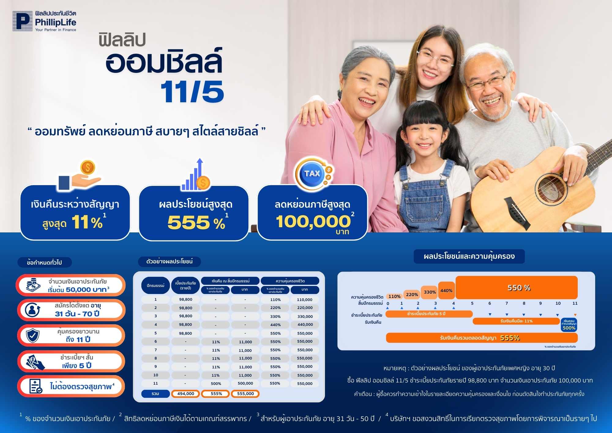 ทั้งนี้ “ฟิลลิป ออมชิลล์ 11/5” รับประกันตั้งแต่อายุ 31 วันจนถึงอายุ 70 ปี จำนวนเงินเอาประกันภัยเริ่มต้น 50,000 บาท รวมผลประโยชน์ตลอดสัญญาทั้งสิ้น 555% ของจำนวนเงินเอาประกันภัย สามารถนำเบี้ยประกันไปใช้สิทธิลดหย่อนภาษีบุคคลธรรมดาได้สูงสุด 100,000 บาท (เงื่อนไขเป็นไปตามที่สรรพากรกำหนด) “ฟิลลิป ออมชิลล์ 11/5” เหมาะสำหรับผู้ที่ต้องการหลักประกันคุ้มครองชีวิต พร้อมผลประโยชน์เพื่อวางแผนเป้าหมายทางการเงิน นอกจากนี้ยังสามารถประหยัดเงินของตนเองด้วยสิทธิประโยชน์ทางภาษีแล้ว และยังช่วยสร้างวินัยทางการเงินอีกด้วย