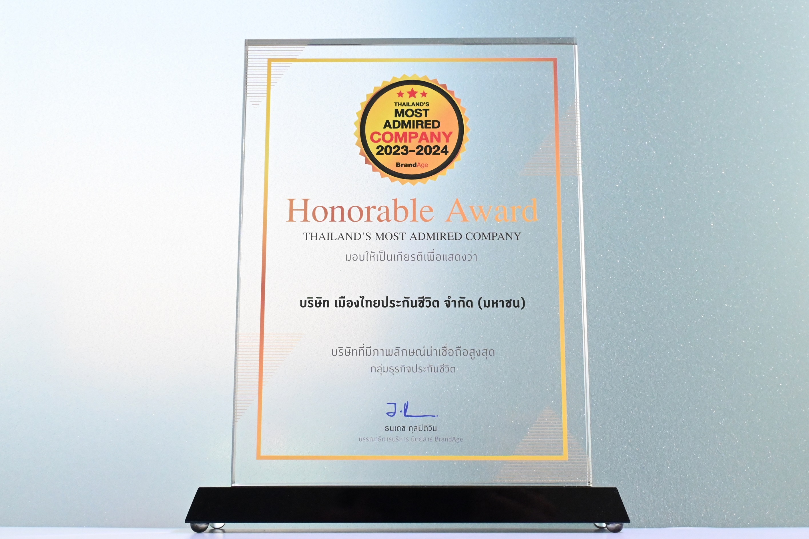 บริษัท เมืองไทยประกันชีวิต จำกัด (มหาชน) ตอกย้ำบริษัทประกันแห่งปี คว้ารางวัล 2023-2024 Thailand’s Most Admired Company จาก BrandAge ผู้นำสื่อนิตยสารการตลาดของเมืองไทย ร่วมกับคณะเทคโนโลยีสื่อสารมวลชน มหาวิทยาลัยเทคโนโลยีราชมงคลพระนคร ในการดำเนินการเก็บแบบสอบถามและประเมินผล เพื่อศึกษาเรื่องความน่าเชื่อถือขององค์กร ในเรื่องของการมีภาพลักษณ์ที่ดีในงานวิจัย โดยมีการจัดอันดับบริษัทต่างๆ โดยใช้หลักการการชี้วัดความชื่นชอบของผู้บริโภคที่มีต่อบริษัทที่มีความโดดเด่นในด้านความสามารถในการสร้างสรรค์นวัตกรรม (Innovation) ความสามารถในการดำเนินธุรกิจ (Business Performance) ภาพลักษณ์ (Corporate Image) การบริหารการจัดการ (Management) ความรับผิดชอบต่อสังคม (Sustainable Development) และการบริการ (Excellence Service)