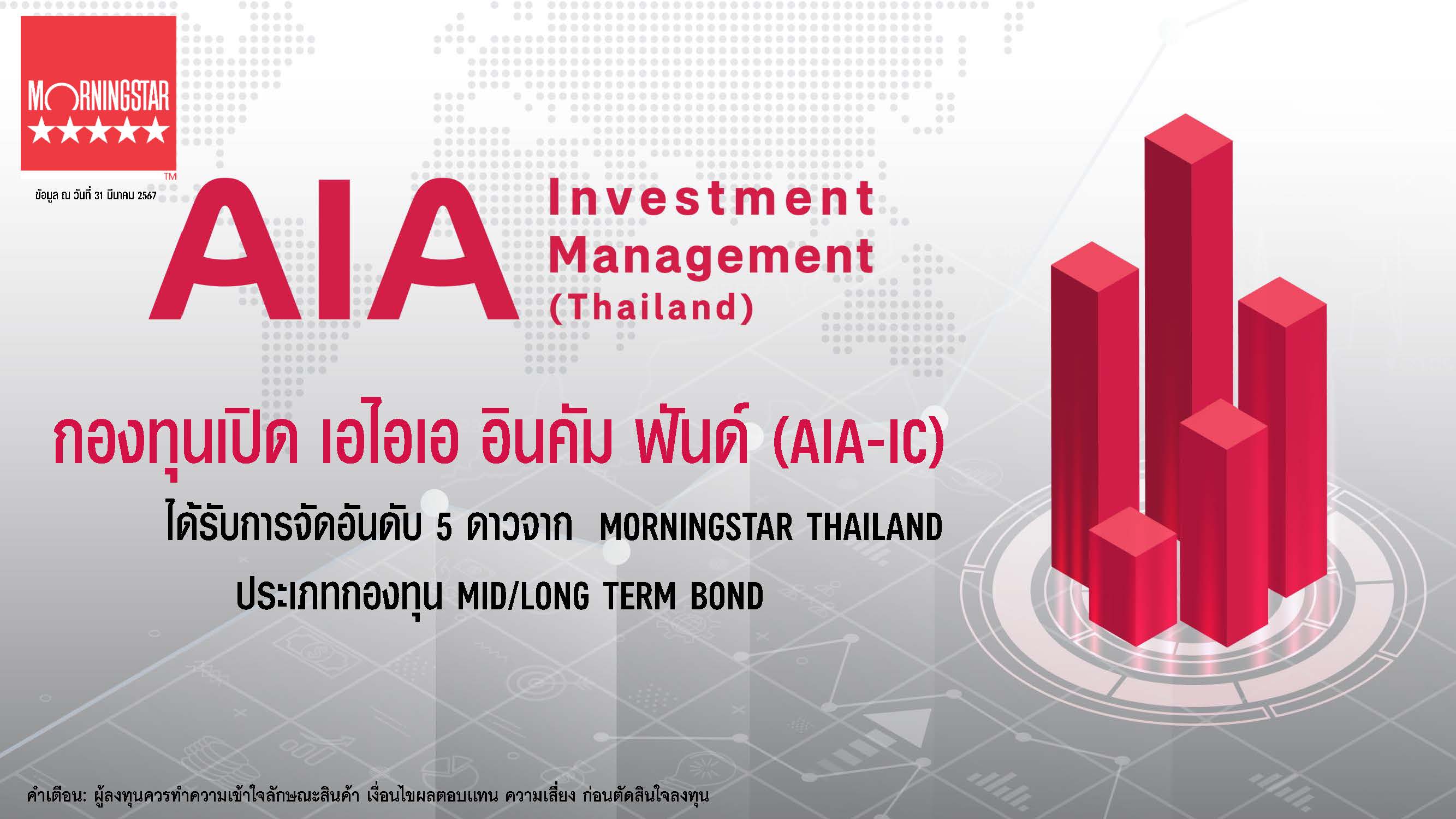 กองทุนเปิด เอไอเอ อินคัม ฟันด์ (AIA-IC) ซึ่งบริหารจัดการโดย บริษัท หลักทรัพย์จัดการกองทุนเอไอเอ (ประเทศไทย) จำกัด ได้รับการจัดอันดับ 5 ดาวจาก Morningstar Thailand ประเภทกองทุน Mid/Long Term Bond ทั้งในส่วนของผลตอบแทนโดยรวม (Performance Overall) และ ผลตอบแทน 3 ปี (3-Y Performance) แสดงให้เห็นถึงความสามารถของทีมผู้จัดการกองทุน บลจ. เอไอเอ (ประเทศไทย) ในการสร้างผลตอบแทนที่ดีอย่างสม่ำเสมอ รวมถึงมีการบริหารความเสี่ยงที่เหมาะสม เพื่อให้ลูกค้าผู้ถือกรมธรรม์เอไอเอ ยูนิต ลิงค์ สามารถไปถึงเป้าหมายทางการเงินที่ตั้งไว้ โดยสำหรับกองทุนเปิด เอไอเอ อินคัม ฟันด์ มีนโยบายการลงทุนในตราสารหนี้ และ/หรือเงินฝาก หรือตราสารเทียบเท่าเงินฝาก ที่ออกโดยภาครัฐบาล รัฐวิสาหกิจ สถาบันการเงิน และ/หรือ ภาคเอกชน ทั้งใน และ/หรือต่างประเทศ ซึ่งมีอันดับความน่าเชื่อถือของตราสารหรือของผู้ออกตราสารที่อยู่ในอันดับที่สามารถลงทุนได้ (Investment Grade) โดยกองทุนจะลงทุนในทรัพย์สินประเภทตราสารหนี้รวมกันทุกขณะไม่น้อยกว่า 80% ของ NAV