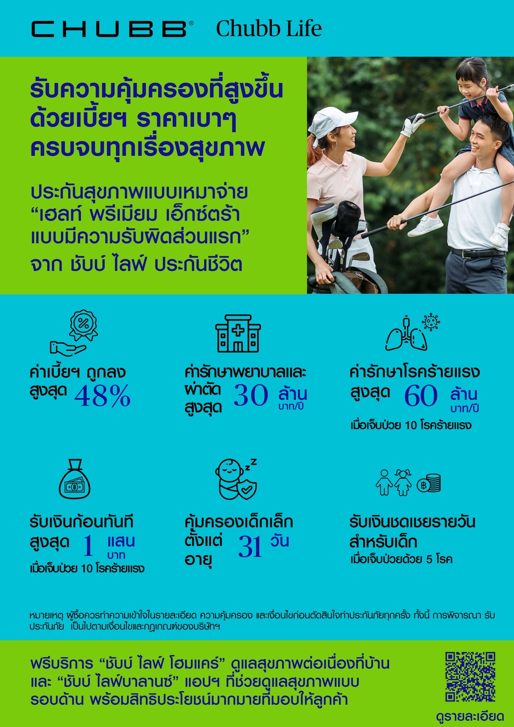 บมจ.ชับบ์ ไลฟ์ แอสชัวรันซ์ หรือ ชับบ์ ไลฟ์ ประกันชีวิต เปิดตัวสัญญาเพิ่มเติมค่ารักษาพยาบาลและผ่าตัด(รพ.) เฮลท์ พรีเมียม เอ็กซ์ตร้า แบบมีความรับผิดส่วนแรก ซึ่งเป็นประกันสุขภาพเหมาจ่ายทางเลือกใหม่ ที่ออกแบบมาเอาใจลูกค้าวัยทำงานที่ต้องการความคุ้มครองที่สูงขึ้น เพิ่มเติมจากกสวัสดิการหรือประกันสุขภาพที่มีอยู่แล้ว เพื่อให้ครอบคลุมกับค่ารักษาพยาบาลในปัจจุบันที่เพิ่มขึ้นอย่างต่อเนื่อง ด้วยเบี้ยฯ ราคาเบากระเป๋า ซึ่งถูกกว่าประกันสุขภาพเหมาจ่ายแบบปกติสูงสุดถึง 48%*