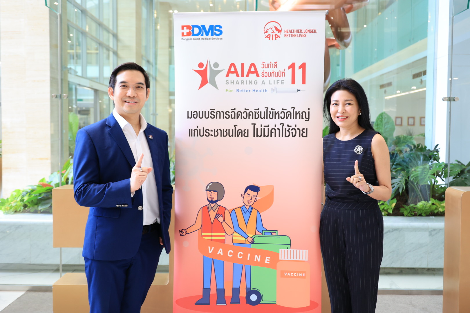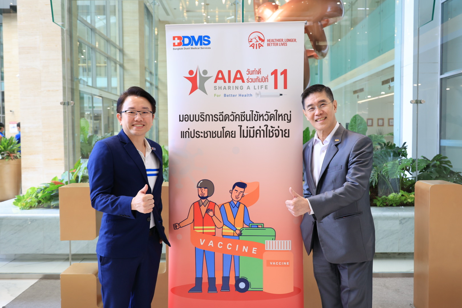 เอไอเอ ประเทศไทย ร่วมมือกับ โรงพยาบาลในเครือ BDMS มอบบริการฉีดวัคซีนไข้หวัดใหญ่แก่ประชาชน โดยไม่มีค่าใช้จ่าย ภายใต้โครงการ AIA Sharing A Life ครั้งที่ 11 นำโดย นายแพทย์ประมุกข์ ทรงจักรแก้ว (กลาง) ที่ปรึกษาอาวุโสฝ่ายปฏิบัติการ นางสาวรพีพร วงศ์ทองคำ (ที่ 3 จากขวา) ผู้อำนวยการฝ่ายสื่อสารองค์กรและภาพลักษณ์ และนายแพทย์สมสกุล ศรีพิสุทธิ์ (ที่ 2 จากขวา) ผู้อำนวยการฝ่ายบริหารจัดการด้านสุขภาพ ร่วมด้วยคณะแพทย์ผู้บริหารโรงพยาบาลกรุงเทพ ประกอบด้วย นายแพทย์มนต์สรร อัศวนพเกียรติ (ที่ 3 จากซ้าย) ผู้อำนวยการฝ่ายผลิตภัณฑ์และโครงสร้างราคา BDMS นายแพทย์อัศวิน ภูวธนสาร (ที่ 2 จากซ้าย) รองผู้อำนวยการโรงพยาบาลกรุงเทพ และแพทย์หญิงกิตนันท์ พิชัยณรงค์ (ขวาสุด) อายุรแพทย์ โรงพยาบาลกรุงเทพ ซึ่งโครงการ AIA Sharing A Life ครั้งที่ 11 จะจัดขึ้นทั้งสิ้น 10 แห่ง ได้แก่