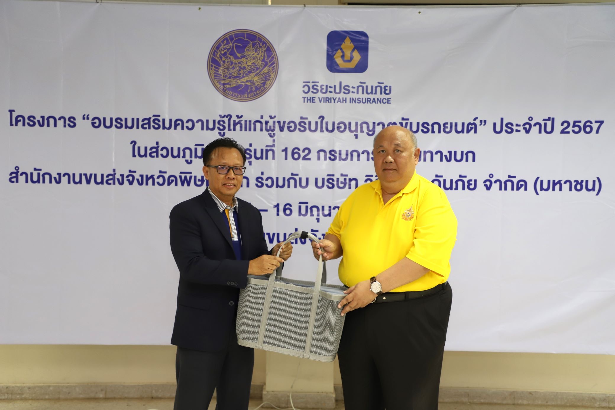 นายสุรชัย ทับยา ขนส่งจังหวัดพิษณุโลก และนายจตุรงค์ แสงสุข รองผู้จัดการฝ่ายปฏิบัติการภาค 1 (ภาคเหนือ) ด้านสาขา บริษัท วิริยะประกันภัย จำกัด (มหาชน) ร่วมเปิดโครงการ “อบรมเสริมความรู้ให้แก่ผู้ขอรับใบอนุญาตขับรถยนต์” รุ่นที่ 162 ซึ่งเป็นโครงการที่ทางบริษัทฯ ร่วมกับ สำนักงานขนส่งจังหวัดพิษณุโลก จัดตั้งขึ้นเพื่อเสริมสร้างความรู้ความเข้าใจเกี่ยวกับการขับขี่รถยนต์สำหรับผู้ขับขี่มือใหม่ และเป็นการอำนวยความสะดวกแก่ผู้ที่ต้องการขอรับใบอนุญาตขับรถยนต์ ในมาตรฐานความปลอดภัยและระเบียบเดียวกับการขอรับใบอนุญาตขับรถยนต์ในวันเวลาราชการ โดยโครงการอบรมฯ ครั้งนี้ มีผู้เข้าร่วมอบรมทั้งสิ้น จำนวน 91 คน ณ สำนักงานขนส่งจังหวัดพิษณุโลก แห่งที่ 2