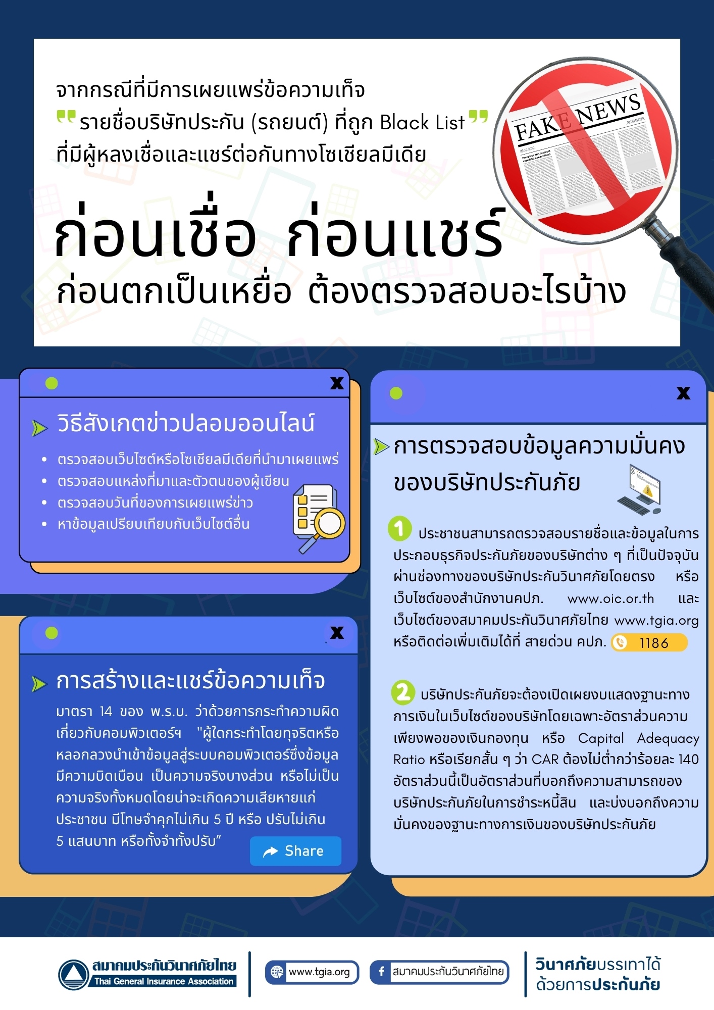 ทุกวันนี้มีข่าวปลอมและข่าวเท็จที่ส่งต่อเผยแพร่กันในอินเทอร์เน็ตและโซเชียลมีเดียมีอยู่เป็นจำนวนมาก ประชาชนผู้รับข่าวสารควรตรวจสอบข้อเท็จจริงของข่าวจากแหล่งข้อมูลที่เชื่อถือได้ก่อนส่งต่อหรือแชร์ทุกครั้ง ดังนั้นหากท่านได้รับข้อมูลข่าวสารเกี่ยวกับบริษัทประกันวินาศภัยที่ส่งต่อมาทางโซเชียลมีเดียและมีข้อสงสัย สามารถสืบค้นข้อเท็จจริงของข้อมูลด้านการประกันภัยได้ที่เว็บไซต์ของสำนักงาน คปภ. (www.oic.or.th) และเว็บไซต์ของสมาคมประกันวินาศภัยไทย (www.tgia.org) หรือติดต่อสอบถามข้อมูลเพิ่มเติมได้ที่สายด่วน คปภ. 1186 หรือ สมาคมประกันวินาศภัยไทย โทร. 0 2108 8399