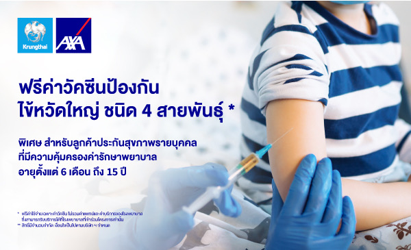 บมจ.กรุงไทย-แอกซ่า ประกันชีวิต ตอกย้ำการเป็นผู้นำด้านประกันชีวิตและบริการด้านสุขภาพ พร้อมอยู่เคียงข้าง ร่วมป้องกันคนที่คุณรักจากโรคไข้หวัดใหญ่ โดยบริษัทฯ ขอมอบสิทธิพิเศษสำหรับลูกค้าสุขภาพรายบุคคลที่มีความคุ้มครองค่ารักษาพยาบาลที่มีอายุตั้งแต่ 6 เดือน ถึง 15 ปี รับสิทธิ์ฉีดวัคซีนป้องกันโรคไข้หวัดใหญ่ ชนิด 4 สายพันธุ์* ทั้งนี้ผู้ปกครองของผู้เอาประกันภัยกรมธรรม์สามารถกดรับสิทธิ์ให้บุตรของท่านได้ผ่านแอปพลิเคชัน Emma by AXA ผ่านเมนู “Rewards PLUS+” ซึ่งบุตรของท่านสามารถเข้ารับบริการฉีดวัคซีนกับโรงพยาบาลที่เข้าร่วมโครงการได้ตั้งแต่ วันที่ 1 – 31 กรกฎาคม 2567 โดยผู้ปกครองหรือผู้เอาประกันภัยจะต้องแสดงรหัสที่ได้รับ (Redemption Code) จาก Rewards PLUS+ บนแอปพลิเคชัน Emma by AXA พร้อมทั้งบัตรประกันสุขภาพของ กรุงไทย-แอกซ่า ประกันชีวิต หรือบัตรประชาชนของผู้เอาประกันได้ที่เคาน์เตอร์โรงพยาบาล