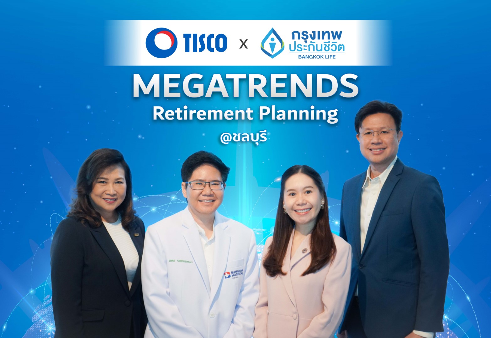 บริษัท กรุงเทพประกันชีวิต จำกัด (มหาชน) และ ธนาคารทิสโก้ จำกัด (มหาชน) จัดงานสัมมนา “เมื่อเป็นโรคหลอดเลือดสมอง...จะเกิดอะไรขึ้น?” แก่ลูกค้าทิสโก้เวลธ์ ณ เอส ศรีราชา โฮเทล แอนด์ เรสซิเดนซ์ อำเภอศรีราชา จังหวัดชลบุรี โดยได้รับเกียรติจาก แพทย์หญิงวรางคณา ศิริรัตน์ แพทยผู้ชำนาญการด้านเวชศาสตร์ป้องกัน BDMS Wellness Clinic (ที่ 3 จากซ้าย) ร่วมให้ความรู้วิธีการป้องกันก่อนป่วยเป็นโรคหลอดเลือดสมอง และแพทย์หญิงสิริณัฐ พึ่งเจริญ อายุรแพทย์โรคระบบประสาทและสมอง เฉพาะทางด้านโรคหลอดเลือดสมอง โรงพยาบาลกรุงเทพพัทยา (ที่ 2 จากซ้าย) ร่วมให้ความรู้ด้านการรักษาโรคหลอดเลือดสมอง