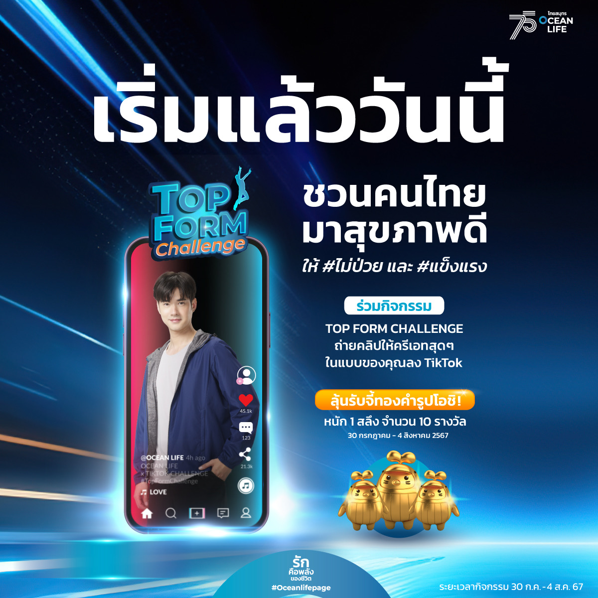 บมจ.ไทยสมุทรประกันชีวิต รักคือพลังของชีวิต โดยคุณนุสรา (อัสสกุล) บัญญัติปิยพจน์ ประธานเจ้าหน้าบริหารและกรรมการผู้จัดการ (CE0) เผยว่า เนื่องในวาระครบรอบ 75 ปี ของ OCEAN LIFE ไทยสมุทร มุ่งเน้นกลยุทธ์ “HEALTHIVERSE” สนับสนุนการสร้างโลกใหม่เพื่อชีวิตและสุขภาพที่ดีของคนไทย พร้อมแนวคิด “ประกันชีวิตและสุขภาพที่ช่วยให้คนไทยไม่ป่วย” เพื่อให้แนวคิดนี้เกิดขึ้นจริง จึงได้จับมือกับแพลตฟอร์มดัง อย่าง TikTok กับแคมเปญ “OCEAN LIFE Top Form Challenge” ชวนคนไทยทุกคน ไม่จำกัดอายุ เพศ วัย ทุกเจนเนอเรชั่น มาช่วยกันสร้างสรรค์ความรักสุขภาพในแบบของคุณ ให้มีชีวิตที่ Top Form ด้วยการถ่ายคลิปลง TikTok และใส่ #TopformChallenge เพียงเท่านี้ก็มีสิทธิ์ลุ้นรับ “จี้ทองคำโอชิ” น้ำหนัก 1 สลึง จำนวน 10 รางวัล มูลค่ารวมกว่า 1 แสนบาท ตั้งแต่วันที่ 30 กรกฎาคม - 4 สิงหาคม 2567 ดูรายละเอียดเพิ่มเติมได้ที่ https://www.ocean.co.th/tiktokchallenge-conditions