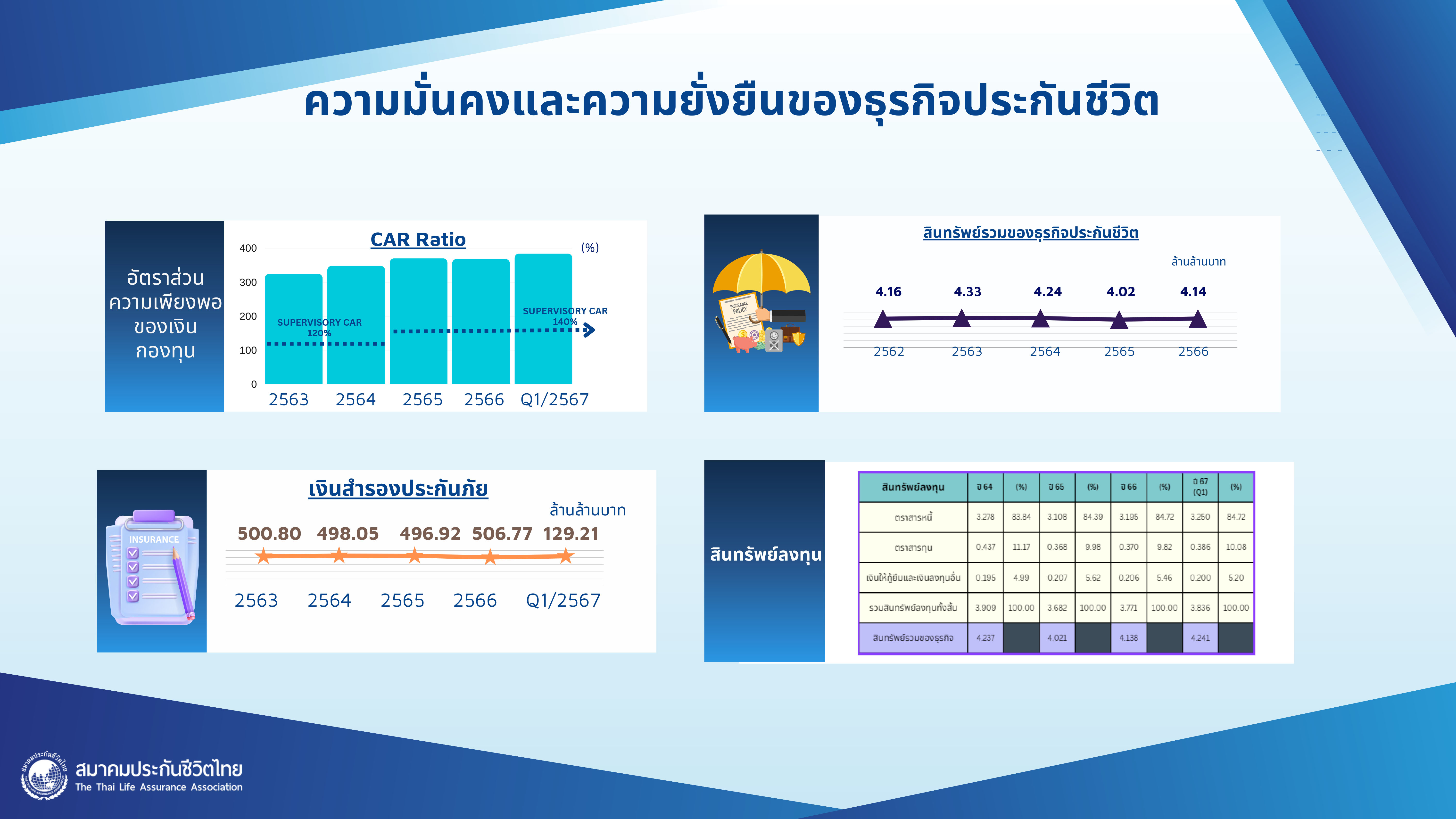 ภาคธุรกิจประกันชีวิตมีอัตราส่วนความพอเพียงของเงินกองทุนตามความเสี่ยง อยู่ที่ร้อยละ 384.21 ซึ่งสูงกว่าอัตราส่วนความเพียงพอของเงินกองทุนที่ใช้ในการกำกับ (Supervisory CAR) จึงขอให้ผู้เอาประกันภัยทุกท่านเชื่อมั่นว่าธุรกิจประกันชีวิตมีความมั่นคง แข็งแกร่ง และยึดมั่นคำสัญญาตามข้อผูกพันในกรมธรรม์ประกันชีวิตทุกกรมธรรม์ที่ออกให้แก่ผู้เอาประกันภัย นายกสมาคมประกันชีวิตไทย กล่าวในตอนท้าย