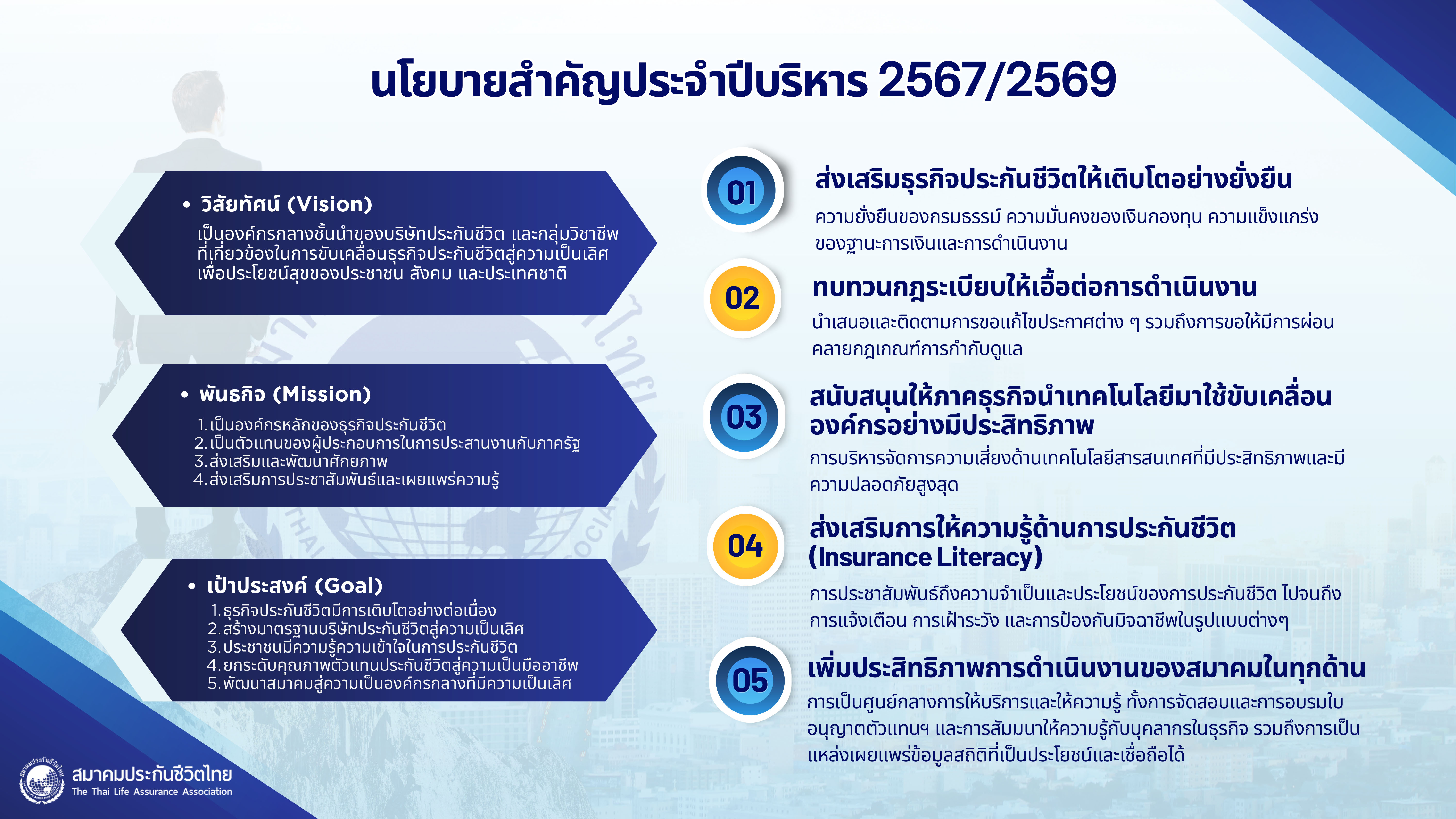 ดังนั้น สมาคมประกันชีวิตไทยจึงมีแผนดำเนินงานเพื่อเตรียมพร้อมรับมือต่อปัจจัยท้าทายรอบด้าน โดยนำแนวคิดการพัฒนาองค์กรให้เติบโตอย่างยั่งยืน (ESG) มาประยุกต์ใช้ในการประกอบการพิจารณาลงทุน การออกแบบ และพัฒนาผลิตภัณฑ์ประกันชีวิต รวมถึงการบริการที่สามารถตอบโจทย์ต่อความต้องการภาคประชาชนและสังคมในทุกด้าน ทั้งมิติของสิ่งแวดล้อม (Environment) มิติของสังคม (Social) และมิติของการกำกับดูแล (Governance) เพื่อให้ธุรกิจประกันชีวิตมีหลักธรรมมาภิบาลสามารถเติบโตอย่างความยั่งยืนมากยิ่งขึ้น