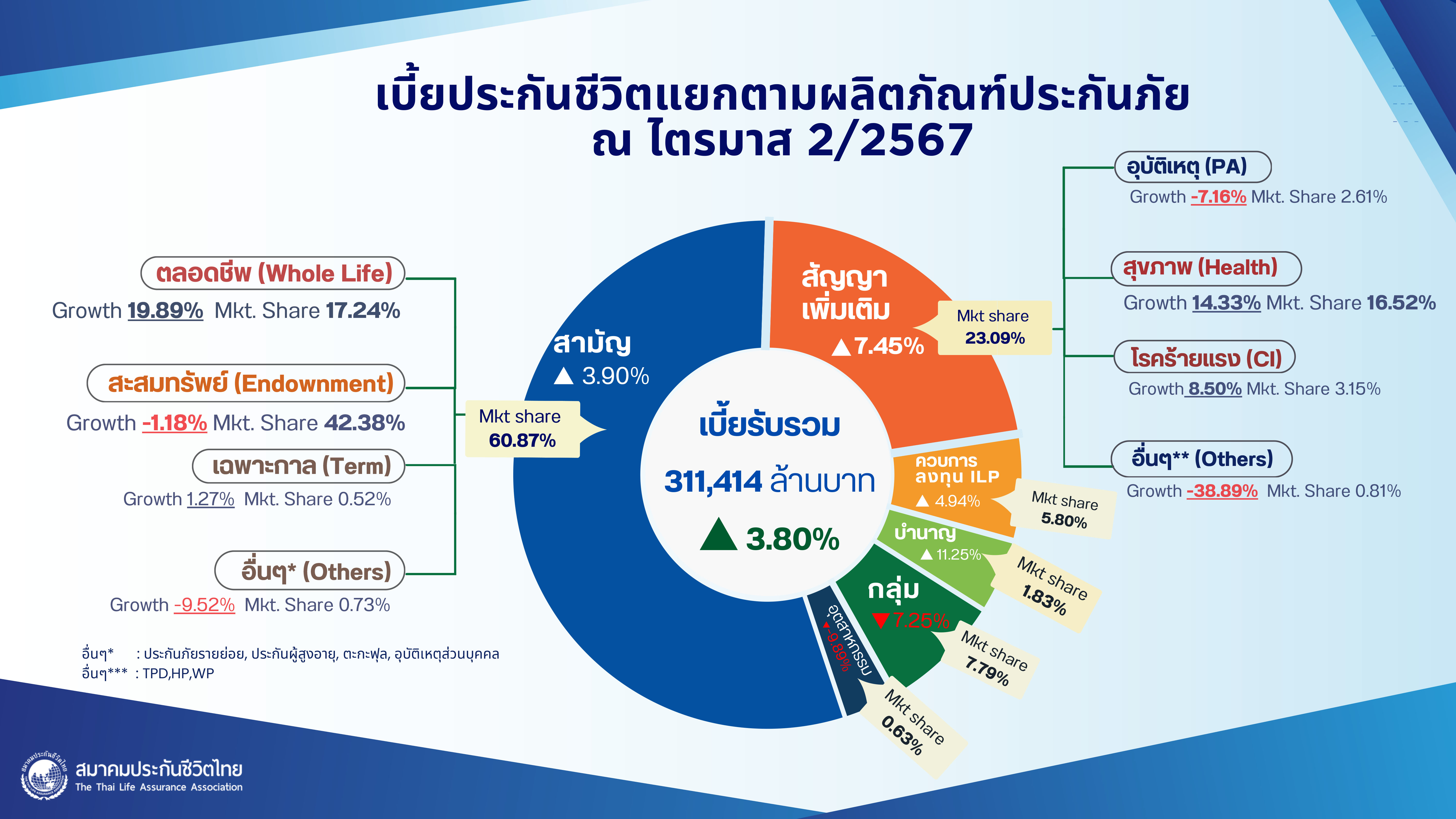 นางนุสรา (อัสสกุล) บัญญัติปิยพจน์ นายกสมาคมประกันชีวิตไทย เผยภาพรวมธุรกิจประกันชีวิตในช่วงครึ่งแรกปี 2567 ระหว่าง มกราคม – มิถุนายน มีเบี้ยประกันภัยรับรวม (Total Premium) อยู่ที่ 311,413.63 ล้านบาท เติบโตเพิ่มขึ้นร้อยละ 3.80 เมื่อเทียบกับปี 2566 จำแนกเป็น เบี้ยประกันภัยรับรายใหม่ (New Business Premium) 88,332.86 ล้านบาท อัตราการเติบโตเพิ่มขึ้นร้อยละ 1.76 และเบี้ยประกันภัยรับปีต่อไป (Renewal Premium) 223,080.77 ล้านบาท มีอัตราการเติบโตเพิ่มขึ้นร้อยละ 4.63 และมีอัตราความคงอยู่ร้อยละ 83