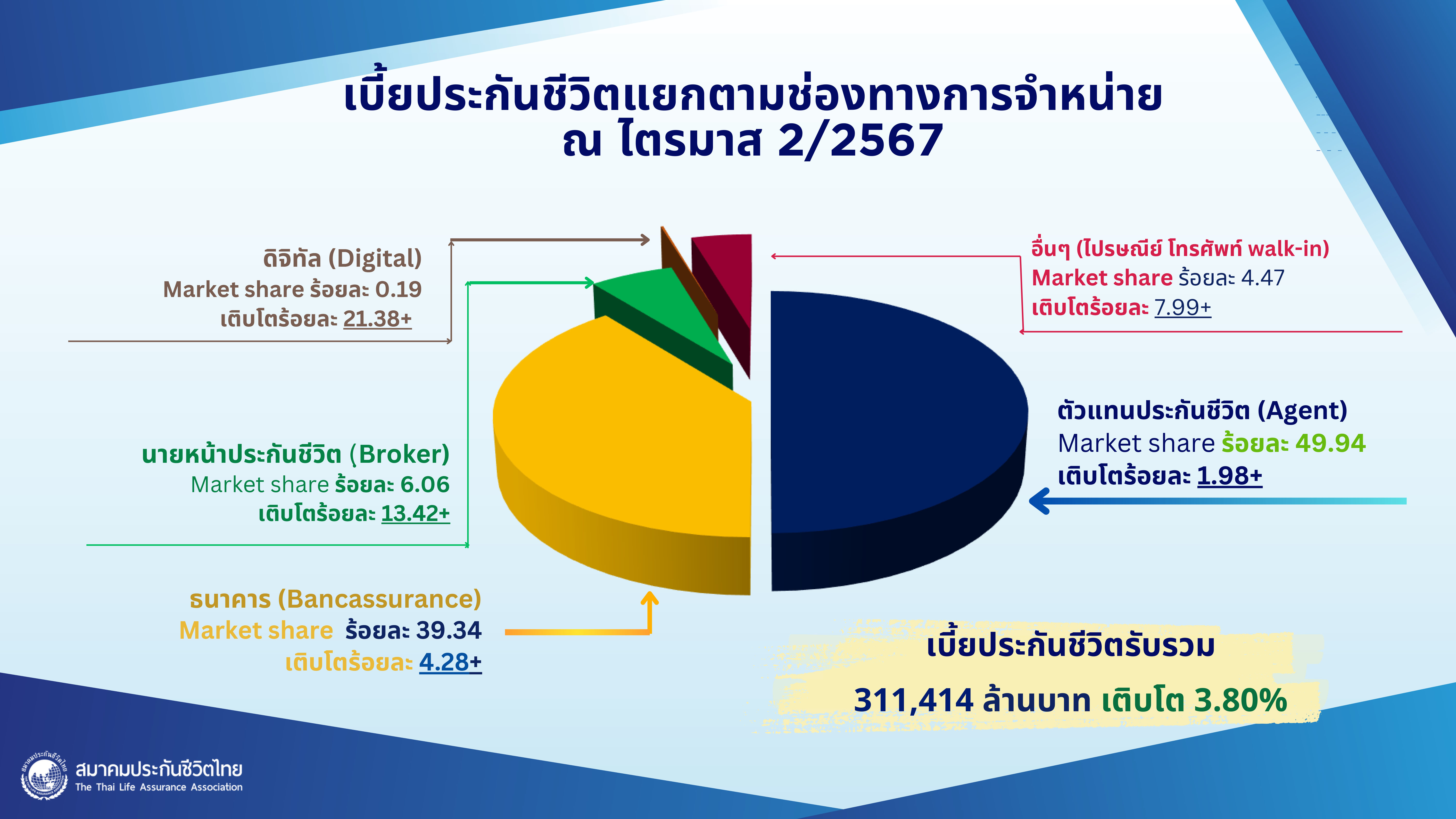 3. การขายผ่านช่องทางนายหน้าประกันชีวิต (Broker) เบี้ยประกันภัยรับรวมอยู่ที่ 18,874.47 ล้านบาท อัตราการเติบโตเพิ่มขึ้นร้อยละ 13.42 เมื่อเทียบกับปี 2566 คิดเป็นสัดส่วนร้อยละ 6.06
