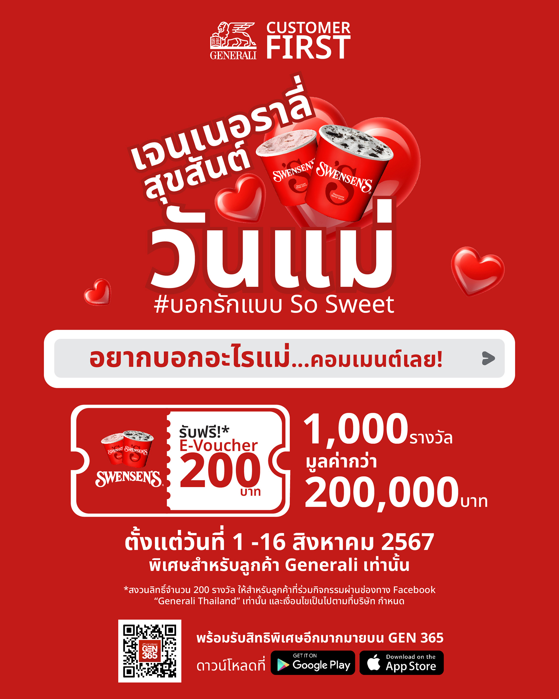 ใกล้ถึงวันแม่แล้ว เจนเนอราลี่ ไทยแลนด์ เตรียมจัดกิจกรรม "#บอกรักแบบ So Sweet" อีกหนึ่งกิจกรรมพิเศษ ภายใต้แคมเปญ ‘Customer FIRST’ เพื่อมอบประสบการณ์สุดเอ็กซ์คลูซีฟ เป็นของขวัญให้ลูกค้า เจนเนอราลี่ ได้พาคุณแม่ ไปร่วมฉลองเติมเต็มความสุขในครอบครัวกับการรับประทานไอศกรีม ที่ร้าน สเวนเซ่นส์ (Swensen’s) มูลค่า 200 บาท จำนวนทั้งสิ้น 1,000 สิทธิ์ รวมมูลค่ากว่า 200,000 บาท เริ่มตั้งแต่วันที่ 1-16 สิงหาคม 2567
