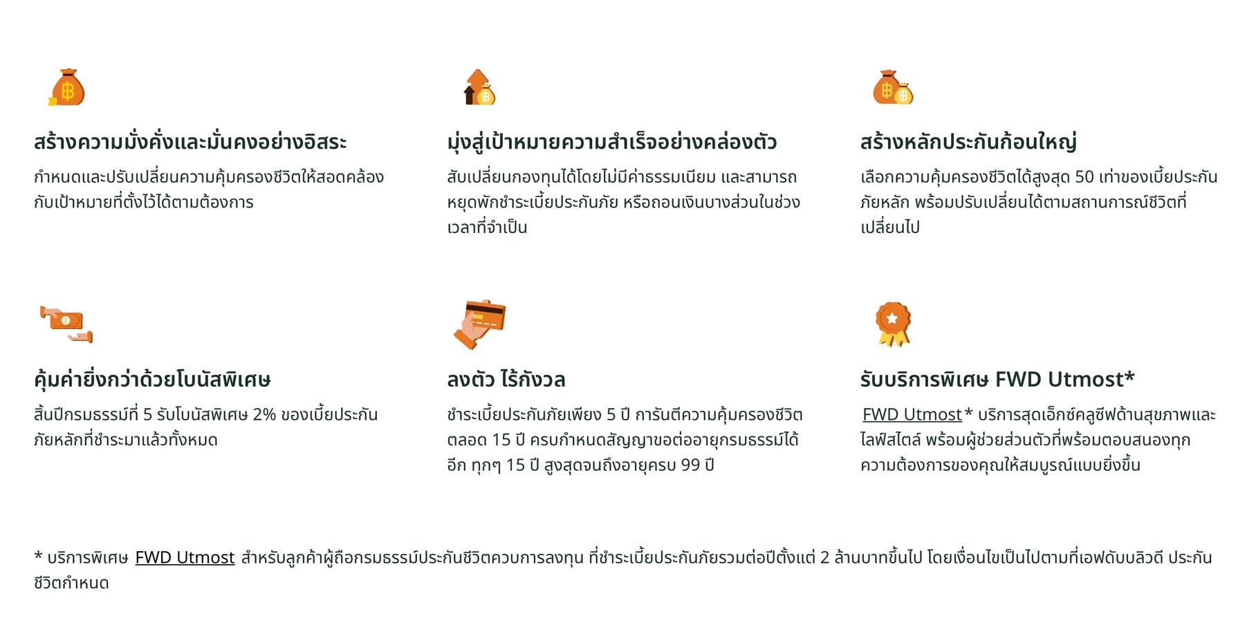 1.สร้างความมั่งคั่งและมั่นคงอย่างอิสระ สามารถปรับเปลี่ยนความคุ้มครองชีวิตให้สอดคล้องกับเป้าหมายที่ตั้งไว้ตามต้องการ และสามารถเพิ่มโอกาสในการรับผลตอบแทนจากการลงทุน ด้วยการ Top Up ชำระเบี้ยประกันภัยเพิ่มพิเศษ อีกทั้งยังสามารถสับเปลี่ยนกองทุนได้โดยไม่มีค่าธรรมเนียม และสามารถหยุดพักชำระเบี้ยประกันภัย หรือถอนเงินบางส่วนในช่วงเวลาที่จำเป็น