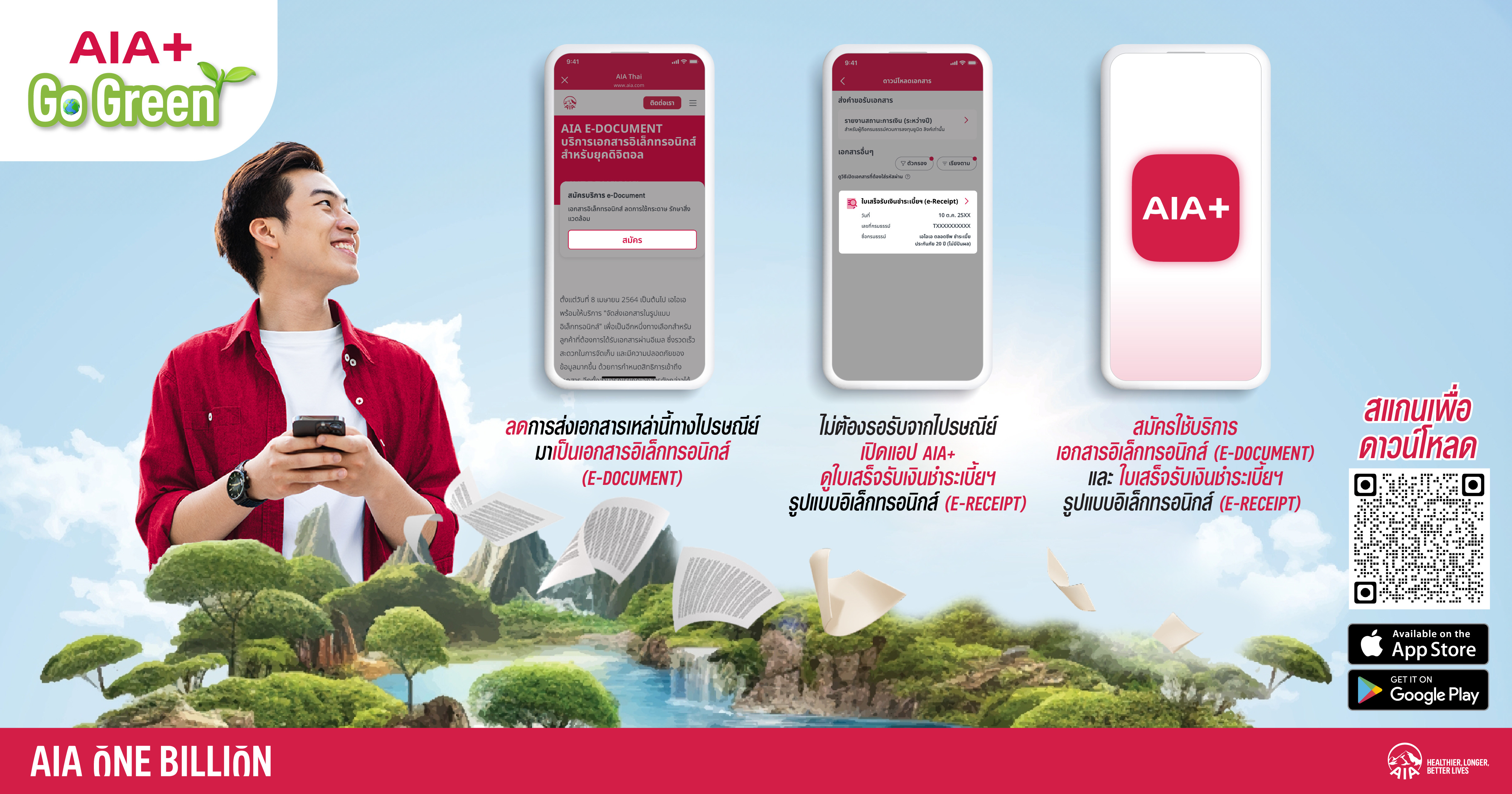 AIA+ จึงริเริ่มแคมเปญ “AIA+ Go Green” ขึ้นเพื่อเชิญชวนให้ผู้ถือกรมธรรม์เอไอเอทุกราย ได้มีส่วนร่วมในการลดการใช้ทรัพยากรและหันมาดำเนินธุรกรรมไร้กระดาษ (Paperless Transactions) ผ่านแอปพลิเคชัน AIA+ และใช้บริการ e-Document (เอกสารอิเล็กทรอนิกส์) และ e-Receipt (ใบเสร็จรับเงินชำระเบี้ยฯ รูปแบบอิเล็กทรอนิกส์) ที่สะดวก ใช้งานง่าย และสามารถช่วยจัดเก็บทุกเอกสารสำคัญได้อย่างปลอดภัยพร้อมใช้งานตลอดเวลา