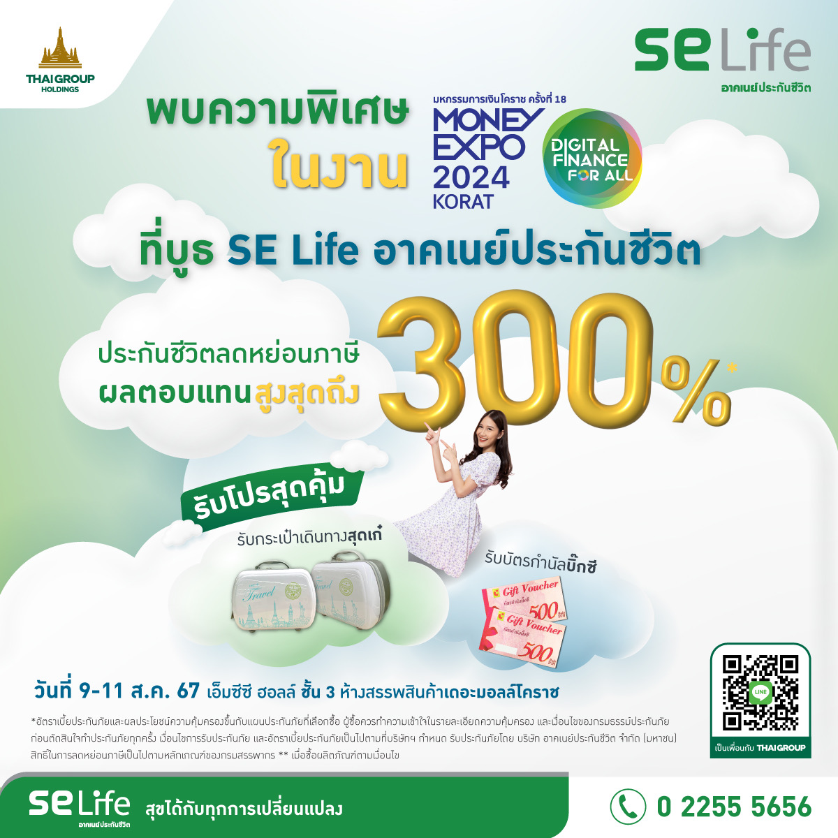 SE Life อาคเนย์ประกันชีวิต ระดมผลิตภัณฑ์ทางการเงินและบริการที่สร้างสุขภาพชีวิตและการเงินที่ดี ตอบโจทย์ทุกความต้องการของลูกค้า พร้อมโปรโมชั่นพิเศษในงานมหกรรมการเงินโคราช ครั้งที่ 18 MONEY EXPO 2024 KORAT ระหว่างวันที่ 9–11 สิงหาคมนี้ ที่เอ็มซีซี ฮอลล์ เดอะมอลล์ โคราช