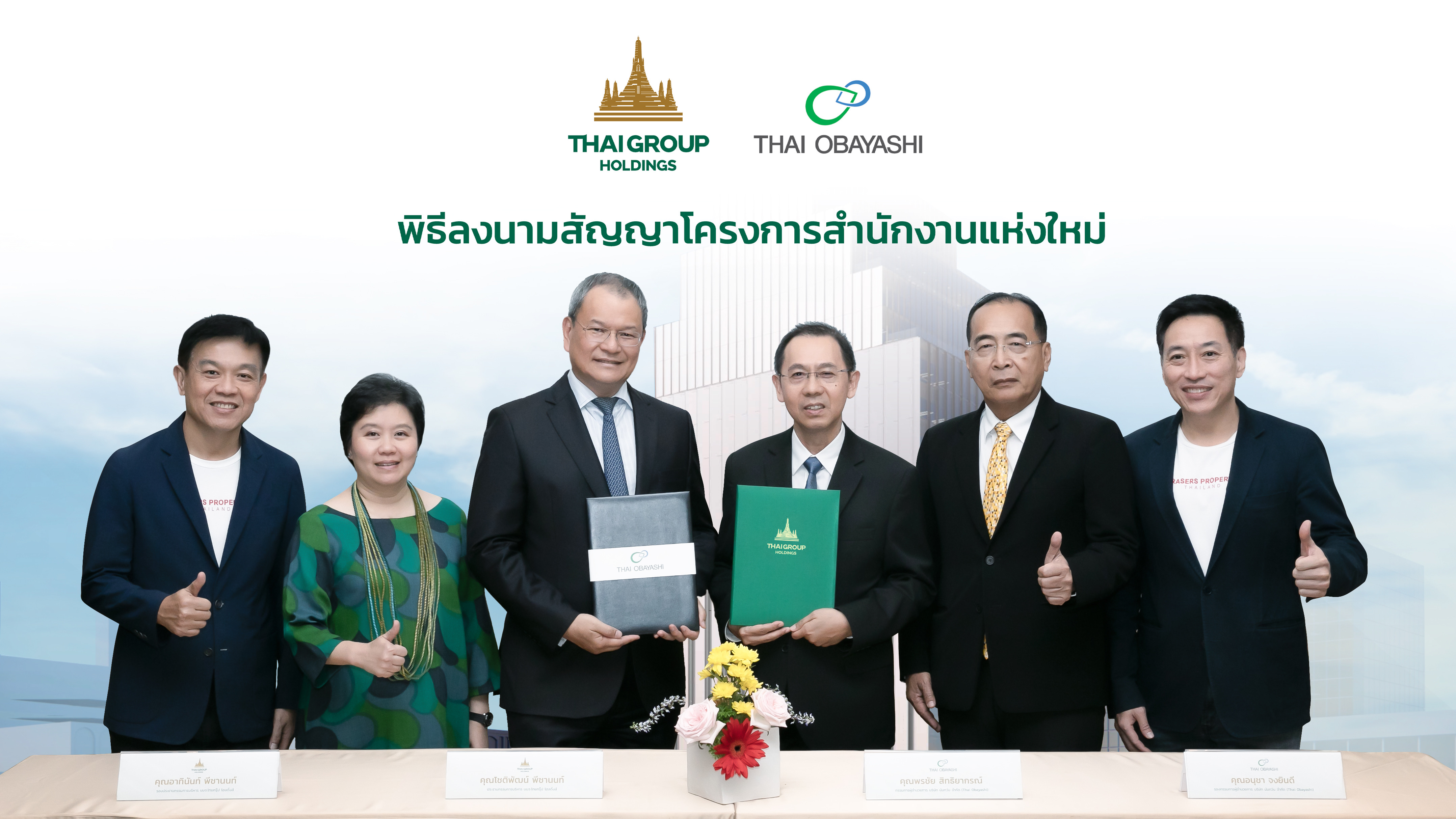 นายโชติพัฒน์ และนางอาทินันท์ พีชานนท์ ประธานและรองประธานกรรมการบริหาร บริษัท ไทยกรุ๊ป โฮลดิ้งส์ จำกัด (มหาชน) กลุ่มธุรกิจประกันและการเงินในเครือทีซีซี ร่วมลงนามกับบริษัท นันทวัน จำกัด (Thai Obayashi) นำโดย นายพรชัย สิทธิยากรณ์ กรรมการผู้อำนวยการ และนายอนุชา จงยินดี กรรมการและรองกรรมการผู้อำนวยการ ในสัญญาจ้างเหมาก่อสร้างอาคารสำนักงานแห่งใหม่ ภายใต้โครงการ Thai Group Quarter โดยมีบริษัท นอร์ท สาธร เรียลตี้ จำกัด ในกลุ่มบริษัท เฟรเซอร์ส พร็อพเพอร์ตี้ (ประเทศไทย) จำกัด (มหาชน) รับเป็นผู้บริหารโครงการ ทั้งนี้ เพื่อรองรับการขยายตัวทางธุรกิจประกัน นำโดย บริษัท อาคเนย์ประกันชีวิต จำกัด (มหาชน)และการเติบโตอย่างยั่งยืนของบริษัทย่อยด้านการเงิน พิธีลงนามจัดขึ้นที่อาคารไทยกรุ๊ป สีลม เมื่อเร็วๆนี้