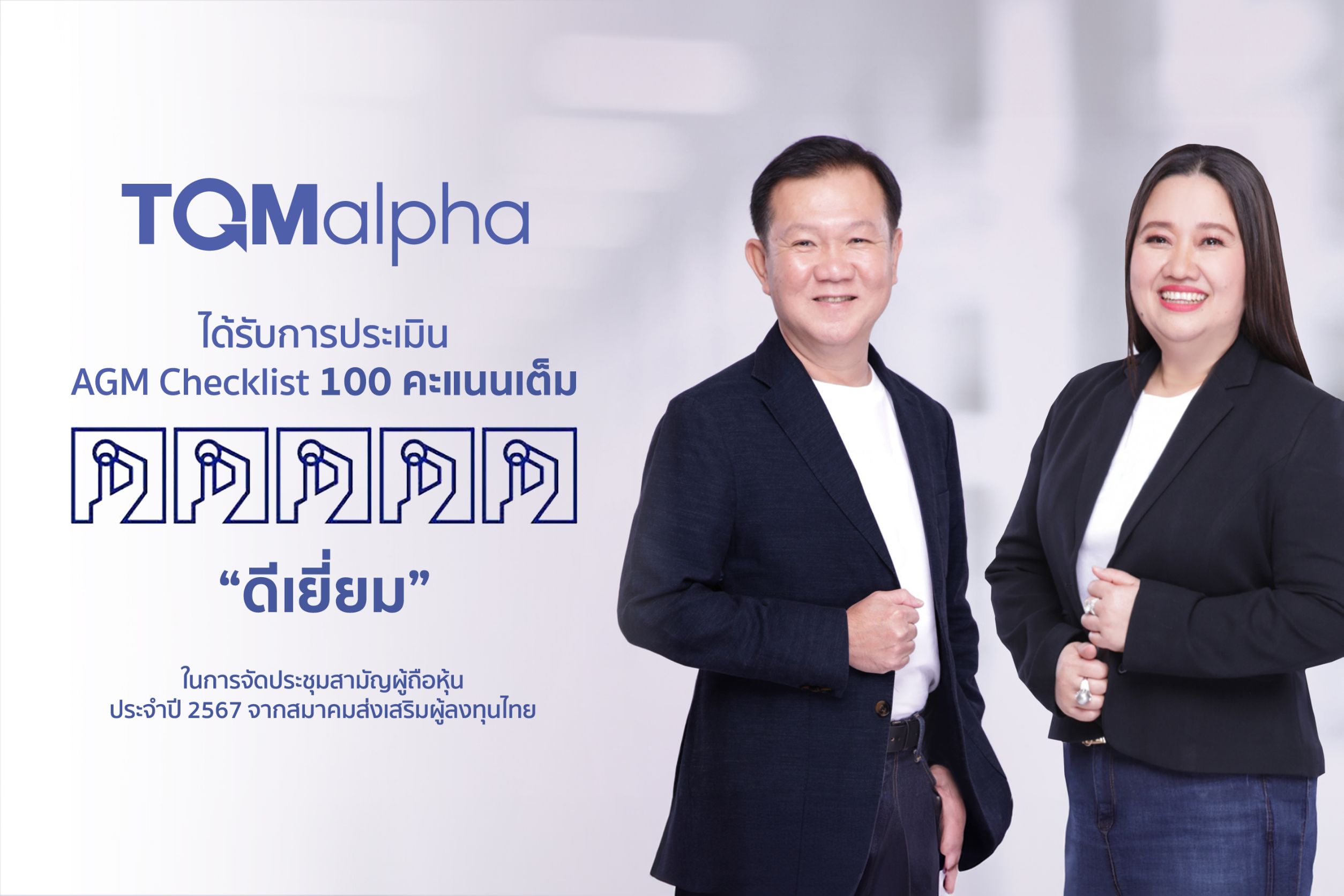 บริษัท ทีคิวเอ็ม อัลฟา จำกัด (มหาชน) หรือ TQMalpha ผู้นำธุรกิจนายหน้าประกันภัย และการเงิน รวมถึงธุรกิจเทคโลโยลีแพลตฟอร์ม ได้รับการประเมินคุณภาพการจัดประชุมสามัญผู้ถือหุ้น (AGM Checklist) ของบริษัทจดทะเบียนในตลาดหลักทรัพย์แห่งประเทศไทย ประจำปี 2567 โดยได้รับคะแนนสูงสุด 100 คะแนนเต็ม ซึ่งได้รับการยกย่องว่าเป็นระดับ "ดีเยี่ยม" ต่อเนื่องเป็นปีที่ 4 ติดต่อกัน จากสมาคมส่งเสริมผู้ลงทุนไทย (Thai Investors Association) และสภาธุรกิจตลาดทุนไทย