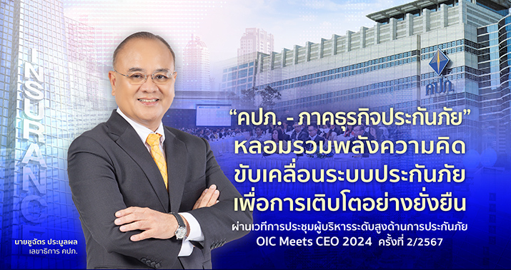 การประชุมผู้บริหารระดับสูงด้านการประกันภัย OIC Meets CEO 2024 ครั้งที่ 2 ในปีนี้ สำเร็จลุล่วง และได้รับความร่วมมือจากภาคธุรกิจประกันภัยเป็นอย่างดี ถือเป็นเวทีระดมความคิดเห็นและความร่วมมือระหว่างสำนักงาน คปภ. กับ ภาคธุรกิจประกันภัย เพื่อร่วมกันกำหนดทิศทางในการขับเคลื่อนและพัฒนาอุตสาหกรรมประกันภัยไทยอย่างเป็นรูปธรรม อันจะส่งผลต่อความเชื่อมั่นของประชาชนและการเติบโตอย่างยั่งยืนของระบบประกันภัยไทย