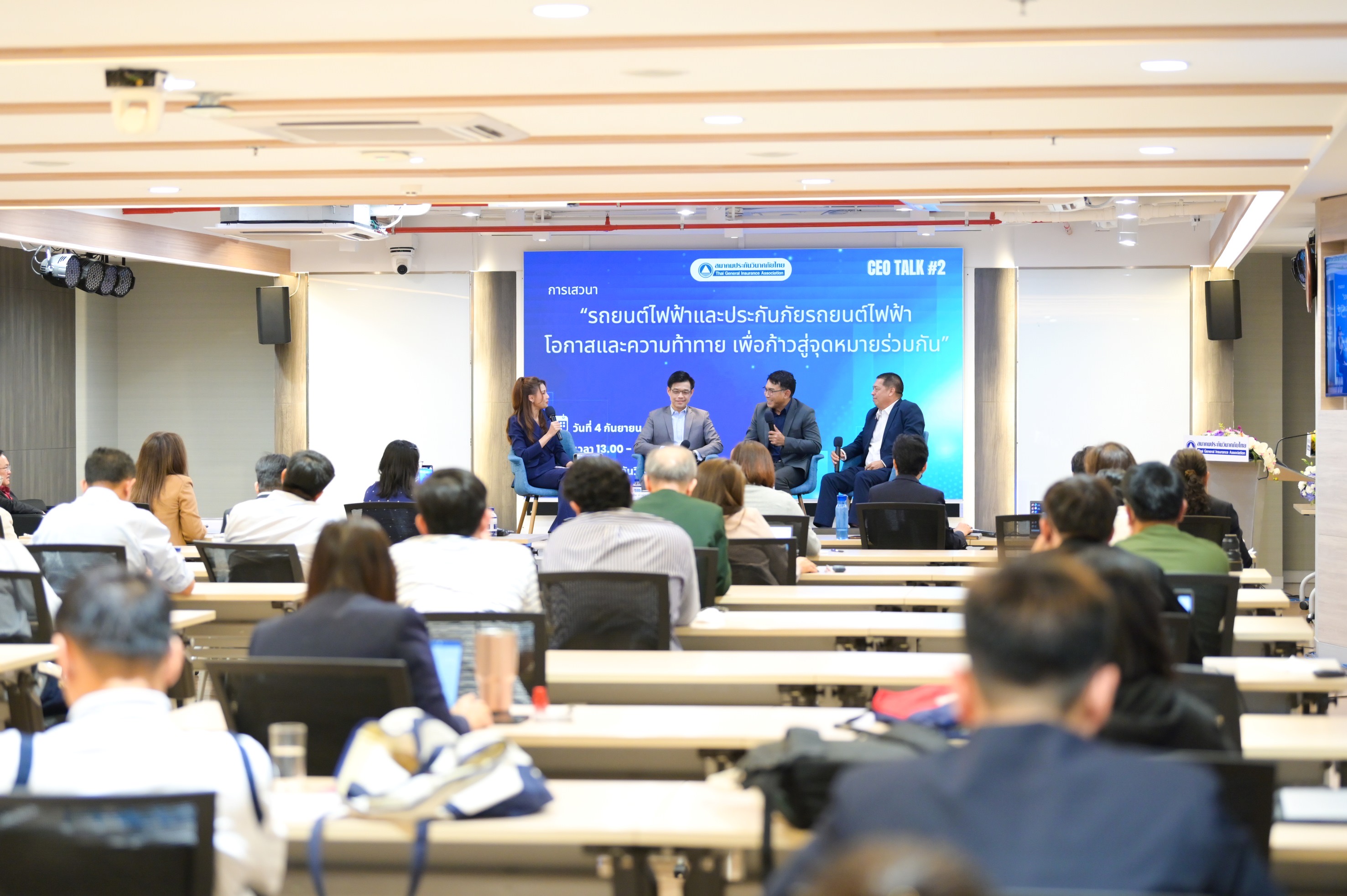 สมาคมประกันวินาศภัยไทย โดยคณะกรรมการพัฒนาธุรกิจและวิชาการประกันภัย จัดงานเสวนา CEO TALK ครั้งที่ 2 ในหัวข้อ “รถยนต์ไฟฟ้าและประกันภัยรถยนต์ไฟฟ้า โอกาสและความท้าทาย เพื่อก้าวสู่จุดหมายร่วมกัน” เปิดโอกาสให้ผู้บริหารในธุรกิจประกันภัยและผู้ที่เกี่ยวข้องได้รับฟังวิสัยทัศน์อย่างใกล้ชิดถึงกรณีศึกษาจากประสบการณ์จริงของผู้นำองค์กรเกี่ยวกับการประกันภัยรถยนต์ EV กับอนาคตรถไฟฟ้าในไทย โดยได้รับเกียรติจาก นายอาภากร ปานเลิศ รองเลขาธิการ ด้านกำกับธุรกิจประกันภัย สำนักงาน คปภ. นายวาสิต ล่ำซำ กรรการผู้จัดการ บริษัท เมืองไทยประกันภัย จำกัด (มหาชน) และประธานคณะกรรมการประกันภัยยานยนต์ นายสุโรจน์ แสงสนิท นายกสมาคมยานยนต์ไฟฟ้าไทย มาร่วมแบ่งปันความรู้และประสบการณ์ โดยมีผู้เข้าร่วมงานจากภาคธุรกิจประกันภัย หน่วยงานที่เกี่ยวข้อง และสื่อมวลชน จำนวน 380 คน ซึ่งจัดขึ้นทั้งในรูปแบบ Onsite ณ ห้องสัมมนา 501 สมาคมประกันวินาศภัยไทย และ Online ผ่านระบบ Zoom Meeting เมื่อเร็ว ๆ นี้