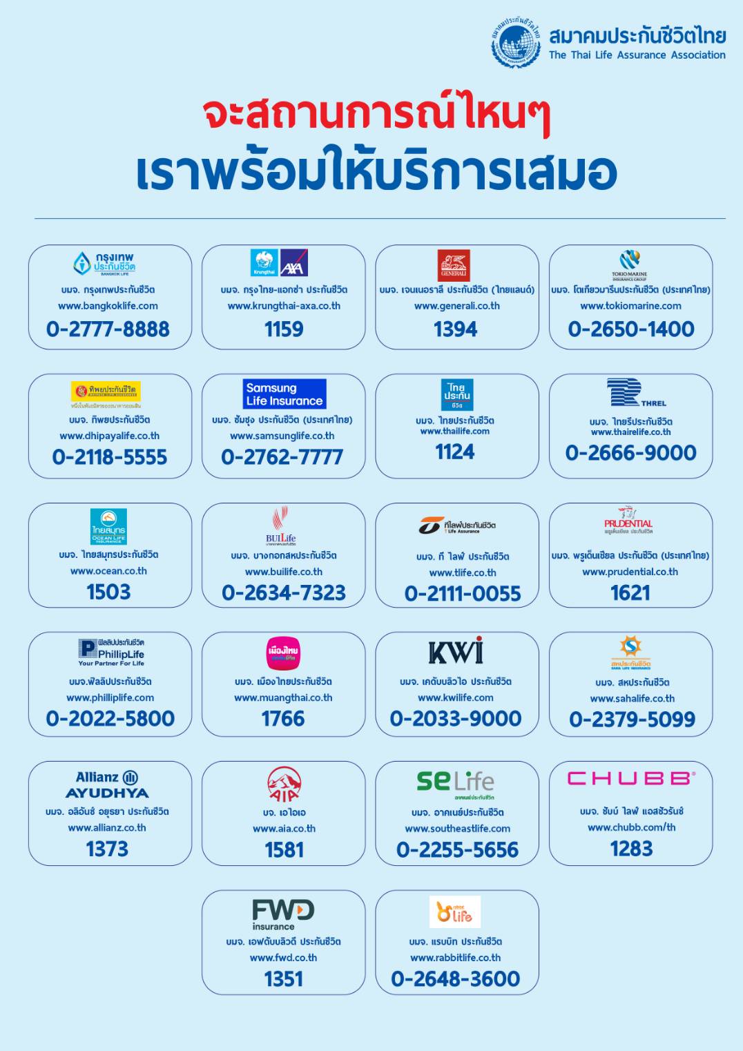 ทั้งนี้ ในส่วนของบริษัทประกันชีวิตได้มีการเตรียมพร้อมรองรับสถานการณ์ฉุกเฉิน เพื่อความต่อเนื่องในการให้บริการแก่ผู้เอาประกันภัยในการใช้บริการต่าง ๆ เช่น การเรียกร้องสินไหมทดแทนจากกรณีต่างๆ การชำระเบี้ยประกันภัย และบริการอื่น ๆ ที่จะช่วยเหลือผู้เอาประกันภัยให้ได้รับความสะดวกภายใต้สถานการณ์ดังกล่าว ซึ่งการใช้บริการขั้นต้นสามารถดำเนินการผ่านช่องทางในรูปแบบต่าง ๆ ทั้งในส่วนของบริษัท สาขา ศูนย์ลูกค้าสัมพันธ์ Call Center ช่องทางอิเล็กทรอนิกส์ เว็บไซต์ แชตบอท เฟสบุ๊ค ไลน์ออฟฟิศเชียล รวมถึงแอพลิเคชั่นต่าง ๆ ที่พร้อมให้บริการได้อย่างต่อเนื่อง