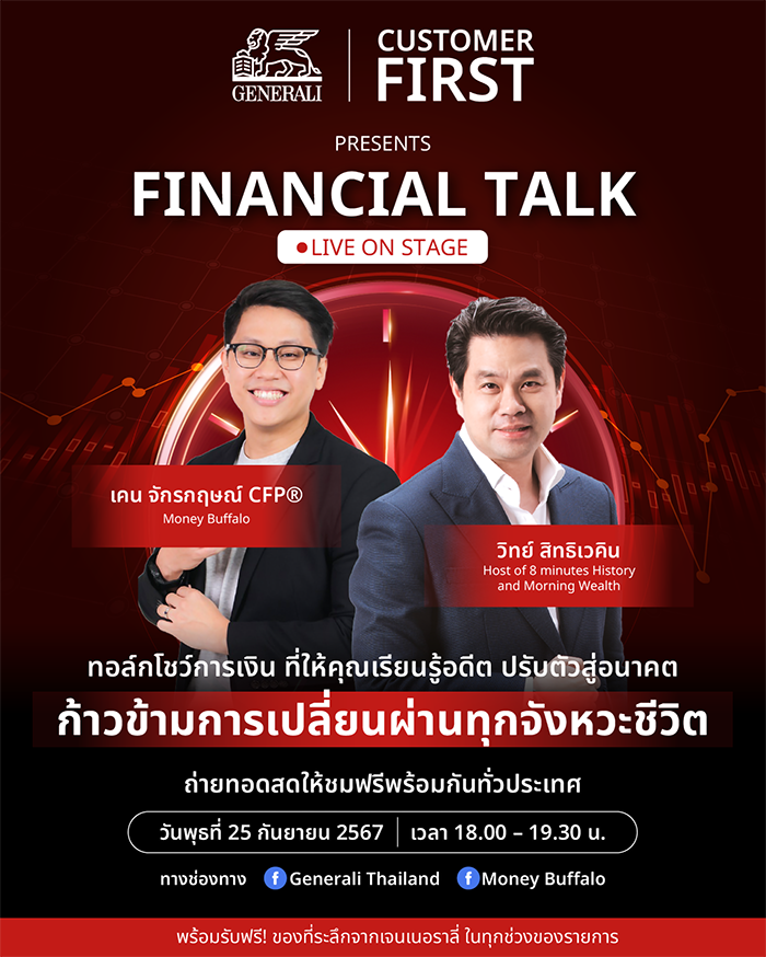 เจนเนอราลี่ ไทยแลนด์ ขอเชิญทุกท่านสัมผัสประสบการณ์เอ็กซ์คลูซีฟแบบ Customer FIRST ในงาน Financial Talk Live on Stage ทอล์กโชว์การเงิน ที่ให้คุณเรียนรู้อดีต เพื่อปรับตัวสู่อนาคต ก้าวข้ามการเปลี่ยนผ่านทุกจังหวะชีวิต ให้เตรียมพร้อมรับมือกับการวางแผนทางการเงินและการลงทุนในอนาคตอย่างมั่นคง