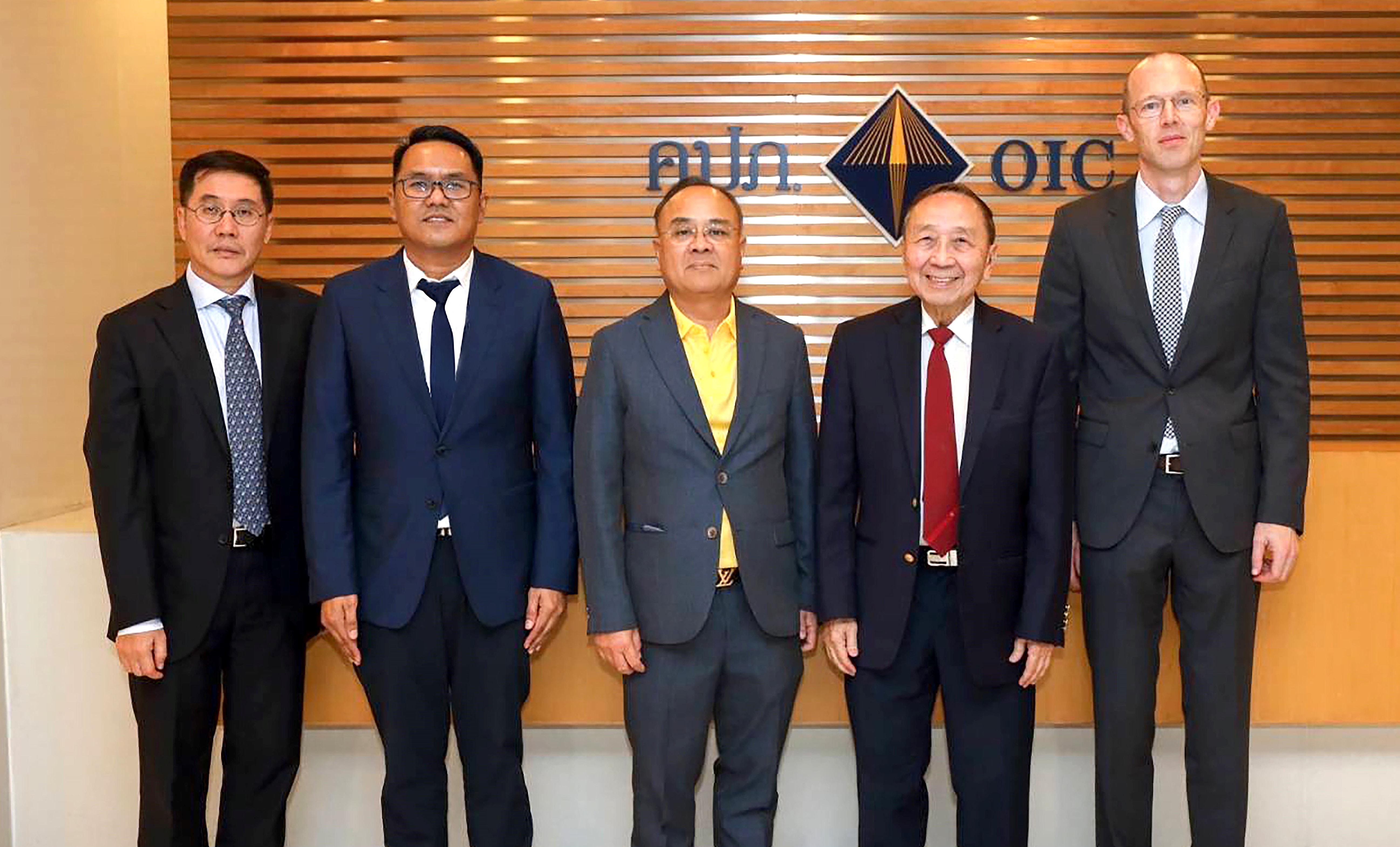 นายฮัว มิน ลิม ประธานกรรมการ บริษัท ฟิลลิปประกันชีวิต จำกัด (มหาชน) (ที่ 2 จากขวา) นายแคมิรอน เฟรซิเออร์ กรรมการ (ที่ 1 จากขวา) นายเมง เฮง ตัน กรรมการ (ที่ 1 จากซ้าย) และนายธฤทธิ์ พรหมนารถ กรรมการผู้จัดการ (ที่ 2 จากซ้าย) ร่วมเดินทางเพื่อเข้าพบ นายชูฉัตร ประมูลผล เลขาธิการคณะกรรมการกำกับและส่งเสริมการประกอบธุรกิจประกันภัย (ที่ 3 จากซ้าย) พร้อมหารือเกี่ยวกับการสร้างมาตรฐานการดำเนินธุรกิจประกันภัย เพื่อเป็นตัวกลางในการนำเสนอผลิตภัณฑ์ประกันภัยแก่ประชาชนได้อย่างมีประสิทธิภาพ ณ สำนักงานคณะกรรมการกำกับและส่งเสริมการประกอบธุรกิจประกันภัย (คปภ.) ถนนรัชดาภิเษก
