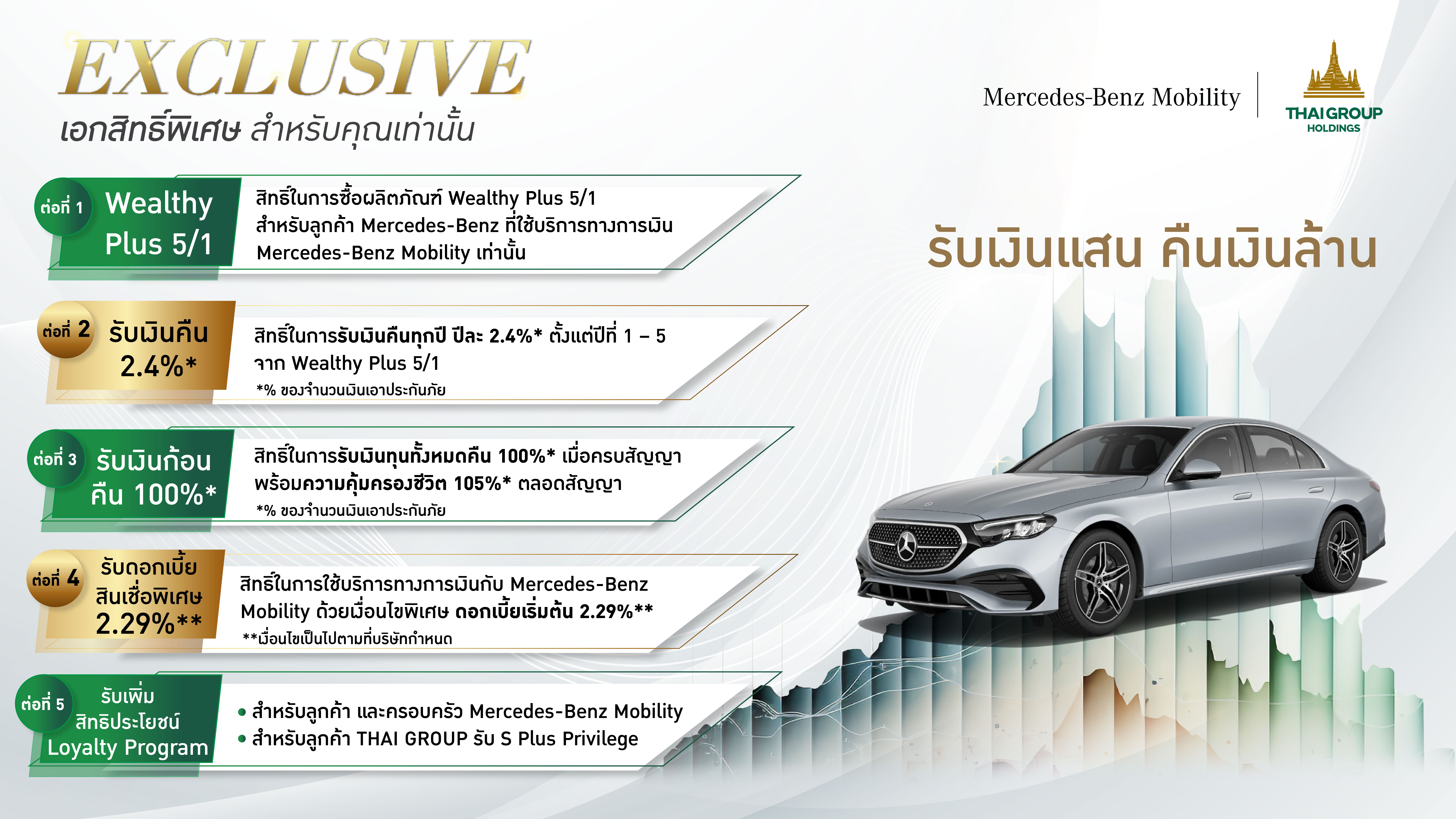 บริษัท ไทยกรุ๊ป โฮลดิ้งส์ จำกัด (มหาชน) กลุ่มธุรกิจประกันและการเงินในเครือทีซีซี โดยนายโชติพัฒน์ พีชานนท์ ประธานกรรมการบริหาร และ บริษัท เมอร์เซเดส-เบนซ์ โมบิลิตี้ (ประเทศไทย) จำกัด ผู้ให้บริการทางการเงินอย่างเป็นทางการสำหรับรถยนต์เมอร์เซเดส-เบนซ์ โดย นายศุภวุฒิ จีรมนัสนาคร ประธานกรรมการบริหาร ผนึกกำลังร่วมสร้างสรรค์นวัตกรรมทางการเงินที่คุ้มค่า สำหรับลูกค้าเมอร์เซเดส-เบนซ์ โมบิลิตี้ จัดงานเปิดตัวแคมเปญ “รับเงินแสน คืนเงินล้าน” ได้ทั้งรถใหม่ ผลตอบแทนพิเศษจากผลิตภัณฑ์ประกันจาก SE Life อาคเนย์ประกันชีวิต “Wealthy Plus 5/1” ที่ออกแบบสำหรับแคมเปญนี้โดยเฉพาะ โดยจ่ายเบี้ยประกันภัยเพียงครั้งเดียว รับเงินคืน 2.4% ของเงินเอาประกันภัย ทุกปี ตลอด 5 ปี และเมื่อครบ 5 ปี ได้เงินคืนทั้งก้อน พร้อมได้รับสิทธิพิเศษอีกมากมายจากไทยกรุ๊ป โฮลดิ้งส์ ผ่านแพลตฟอร์ม S Plus Loyalty Program เฉพาะลูกค้าเมอร์เซเดส-เบนซ์ ที่ใช้บริการทางการเงินกับเมอร์เซเดส-เบนซ์ โมบิลิตี้ (ประเทศไทย) เท่านั้น