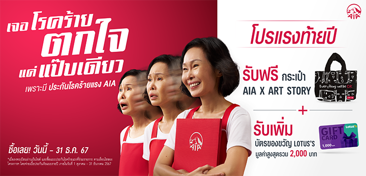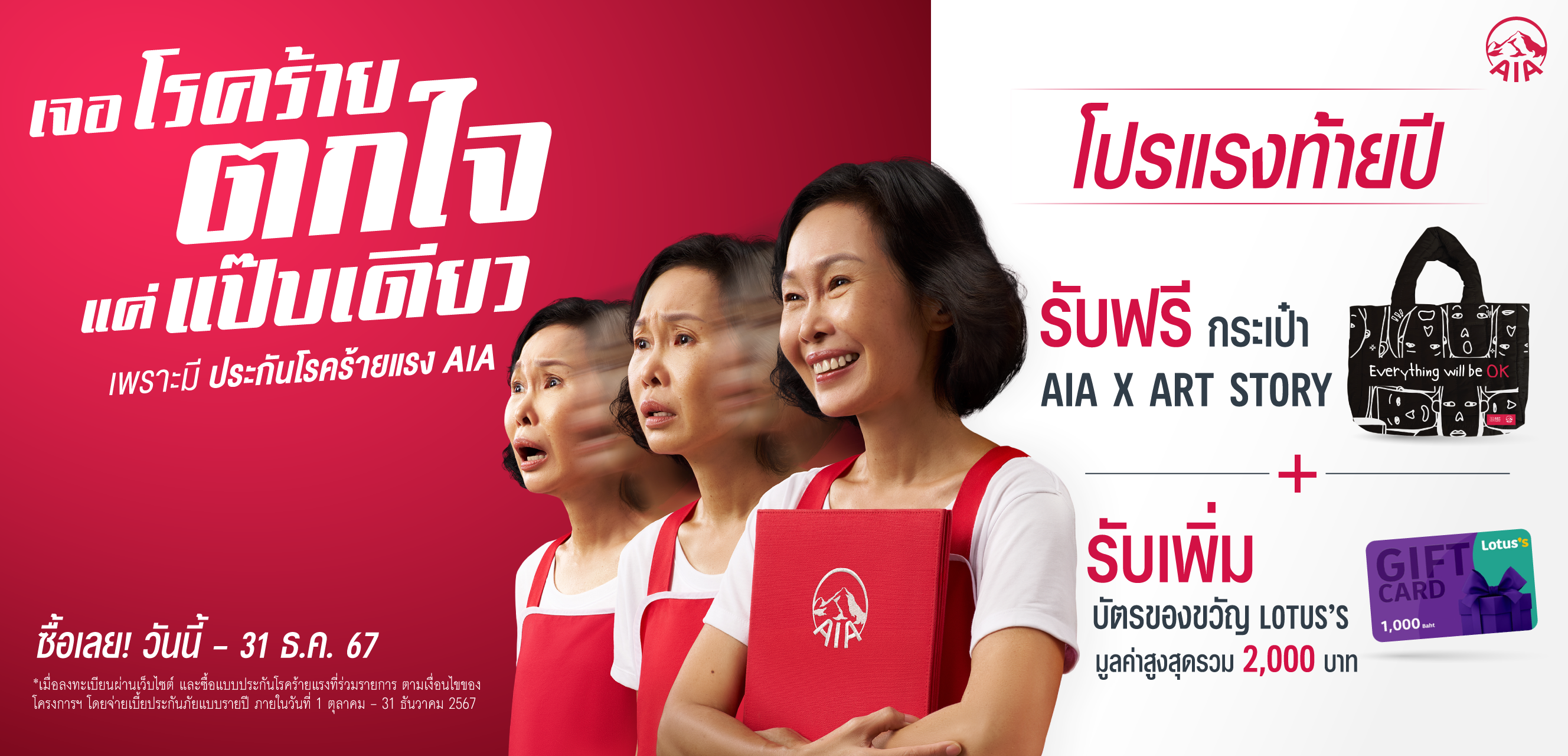 พิเศษยิ่งกว่าสำหรับแคมเปญ “เจอโรคร้าย ตกใจแค่แป๊บเดียว” ยังมีโปรโมชันและสิทธิพิเศษให้กับลูกค้าที่สนใจซื้อประกันโรคร้ายแรงตั้งแต่วันนี้ ถึง 31 ธันวาคม 2567 โดยเอไอเอ ได้รวมแพ็กประกันโรคร้ายแรงตัวท็อป ถึง 10 แผนมาให้ลูกค้าได้เลือกให้ตรงกับความต้องการและเหมาะสมกับค่าใช้จ่ายที่จำเป็น อาทิ ‘AIA CI Plus ประกันโรคร้ายแรง เจอ-จ่าย-จบ’ ที่ให้เงินก้อนไว้ใช้รักษา ‘AIA Multi-Pay CI Plus ประกันโรคร้ายแรง เจอ-จาย-หลายจบ’ ที่ให้เคลมได้รวมสูงสุดถึง 11 ครั้ง และ ‘AIA Care For Cancer ประกันชดเชยรายได้’ สำหรับการรักษาตัวในโรงพยาบาล เนื่องจากป่วยเป็นโรคมะเร็ง ทั้งนี้ ลูกค้ายังมีสิทธิพิเศษมากมาย เมื่อเข้าร่วมแคมเปญ ต่อที่หนึ่ง รับฟรีกระเป๋า AIA X ARTSTORY By Autistic Thai มูลค่า 250 บาท เมื่อมีเบี้ยประกันภัยรวมต่อปีขั้นต่ำ 25,000 บาท* และต่อที่สอง รับเพิ่มบัตรของขวัญ Lotus’s มูลค่า 1,000 บาท เมื่อมีเบี้ยประกันภัยรวมต่อปีขั้นต่ำ 55,000 บาท* และพิเศษถ้าซื้อประกันสุขภาพที่ร่วมโครงการฯ รับเพิ่มบัตรของขวัญ Lotus’s มูลค่าสูงสุด 1,000 บาทอีกด้วย เมื่อมีเบี้ยประกันภัยรวมขั้นต่ำ 25,000 บาท* ซึ่งทุกคนสามารถเข้าร่วมแคมเปญได้ง่าย ๆ เพียงลงทะเบียนผ่านเว็บไซต์ และซื้อประกันโรคร้ายแรงที่เข้าร่วมแคมเปญ** ตั้งแต่วันนี้ ถึง 31 ธันวาคม 2567 โดยสามารถศึกษารายละเอียดแคมเปญได้ที่เว็บไซต์ https://www.aia.co.th/th/events-promotions/promotions-rewards/dmtquarterly สนใจสามารถติดต่อตัวแทนเอไอเอ หรือ AIA Call Center