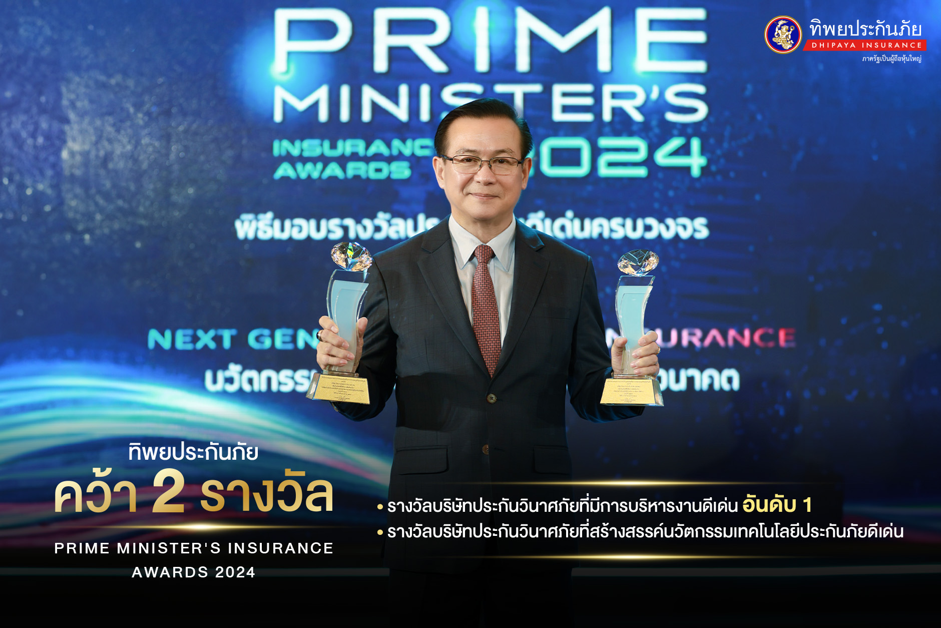 ดร.สมพร สืบถวิลกุล กรรมการผู้จัดการใหญ่ บริษัท ทิพยประกันภัย จำกัด (มหาชน) เข้ารับรางวัลบริษัทประกันวินาศภัยที่มีการบริหารงานดีเด่น อันดับ 1 และ รางวัลบริษัทประกันวินาศภัยที่สร้างสรรค์นวัตกรรมเทคโนโลยีประกันภัยดีเด่น จากสำนักงานคณะกรรมการกำกับและส่งเสริมการประกอบธุรกิจประกันภัย (คปภ.) ในงานมอบรางวัลประกันภัยดีเด่นครบวงจร (Prime Minister’s Insurance Awards 2024) ประจำปี 2567 โดยได้รับเกียรติจากนายพิชัย ชุณหวชิร รองนายกรัฐมนตรี และรัฐมนตรีว่าการกระทรวงการคลัง เป็นประธานในงานและมอบรางวัลอันทรงเกียรตินี้