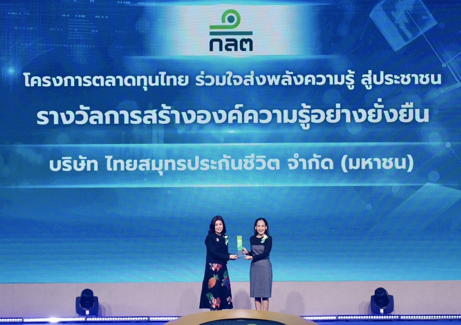 คุณนุสรา (อัสสกุล) บัญญัติปิยพจน์ ประธานเจ้าหน้าที่บริหารและกรรมการผู้จัดการ (CEO) บมจ.ไทยสมุทรประกันชีวิต รับรางวัล “การสร้างองค์ความรู้อย่างยั่งยืน” จาก รศ.ดร.พรอนงค์ บุษราตระกูล เลขาธิการ ก.ล.ต. ในโครงการ “ตลาดทุนไทย ร่วมใจส่งพลังความรู้ สู่ประชาชน เฟส 2” จัดโดยสำนักงานคณะกรรมการกำกับหลักทรัพย์และตลาดหลักทรัพย์ (ก.ล.ต.) ซึ่งรางวัลนี้มอบให้แก่องค์กรที่มีความโดดเด่นในการส่งเสริมความรู้ทางการเงินแก่ประชาชนอย่างต่อเนื่องและยั่งยืน ณ โรงแรมพูลแมน คิงพาวเวอร์