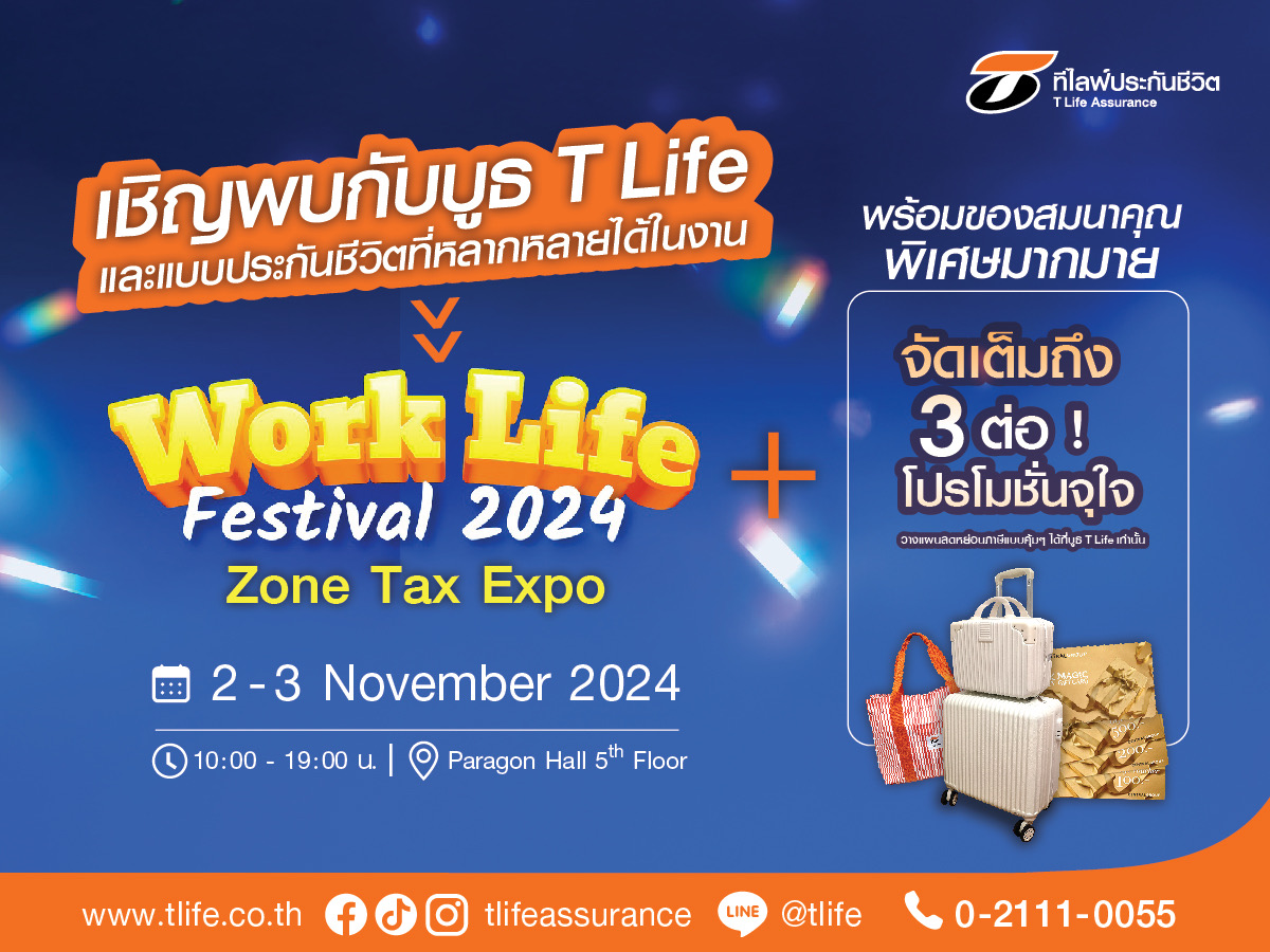 ที ไลฟ์ ประกันชีวิต ยกทัพผลิตภัณฑ์ประกันชีวิตเข้าร่วมงาน “Work Life Festival 2024” ชูจุดเด่นด้วยแบบประกันที่ตอบโจทย์ทุกความต้องการ ทั้งการลดหย่อนภาษีและการออมระยะสั้นที่ให้ผลตอบแทนสูง พร้อมโปรโมชั่นแบบจัดเต็มและของสมนาคุณพิเศษให้ลูกค้าเลือกสรรภายในงาน ซึ่งจัดขึ้นระหว่างวันที่ 2-3 พฤศจิกายน 2567 บริเวณพารากอน ฮอลล์ ชั้น 5 สยามพารากอน