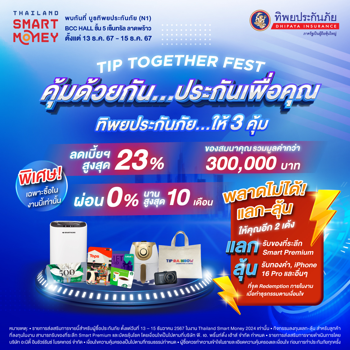 ขอเชิญผู้ที่สนใจ รับข้อเสนอสุดพิเศษได้ที่บูธทิพยประกันภัย (N1) ได้ในงาน Thailand Smart Money 2024 ณ BCC Hall ชั้น 5 เซ็นทรัล ลาดพร้าว ตั้งแต่วันที่ 13 - 15 ธันวาคม 2567
