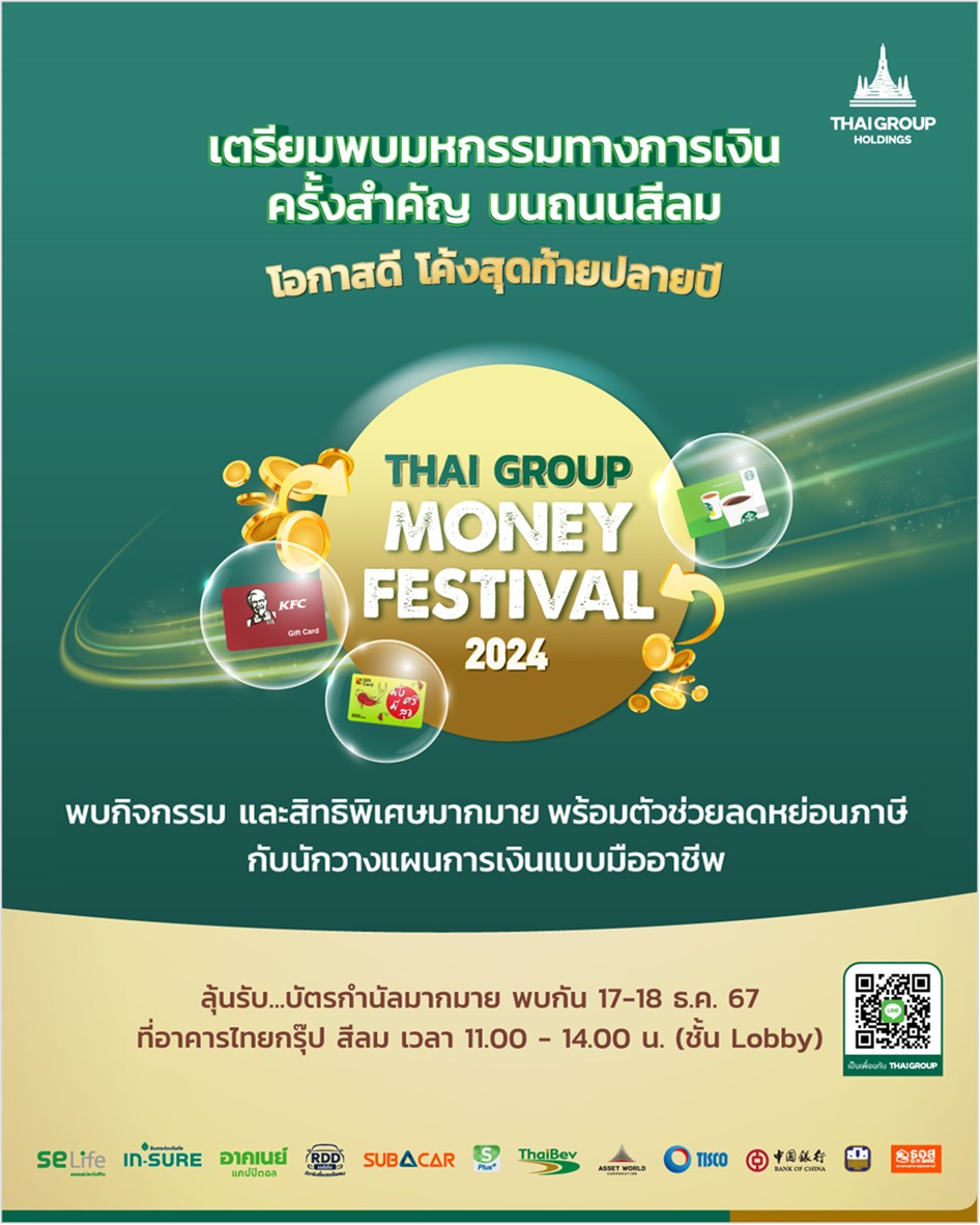 บริษัท ไทยกรุ๊ป โฮลดิ้งส์ จำกัด (มหาชน) กลุ่มธุรกิจประกันและการเงินในเครือทีซีซี เชิญชวนทุกท่าน เข้าร่วมงานมหกรรมการเงิน Thai Group Money Festival 2024 พบกับผลิตภัณฑ์ทางการเงินและการให้บริการที่สร้างคุณภาพชีวิตและการเงินที่ดีจาก 3 สายธุรกิจหลักของไทยกรุ๊ป ได้แก่ อาคเนย์ประกันชีวิต (SE Life) อินทรประกันภัย (IN-SURE) และ อาคเนย์แคปปิตอล (SECAP) ที่มาพร้อมผลิตภัณฑ์ประกันชีวิต-สุขภาพ ประกันลดหย่อนภาษี ผลิตภัณฑ์ประกันภัยที่ช่วยสร้างความอุ่นใจในชีวิตและทรัพย์สิน รวมถึงบริการรถเช่าส่วนบุคคลและองค์กร ออนไลน์สะดวกสบาย 24 ชั่วโมง จาก SUB A CAR และรถยนต์มือสองไมล์แท้คุณภาพดี จาก บริษัท รถดีเด็ด ออโต้ จำกัด (RDD) พร้อมด้วยแคมเปญโปรโมชัน และกิจกรรมต่างๆ ภายในงาน