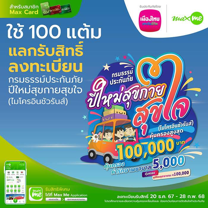 เมืองไทยประกันชีวิต และ แมกซ์ โซลูชัน บริษัทในเครือพีทีจี ผนึกกำลังส่งมอบความสุขและรอยยิ้มในช่วงเทศกาลต้อนรับปีใหม่ 2568 แก่สมาชิก Max Card ทั่วประเทศ ผ่าน “กรมธรรม์ประกันภัยปีใหม่สุขกายสุขใจ (ไมโครอินชัวรันส์)” อุ่นใจด้วยความคุ้มครองครอบคลุมทั้งด้านชีวิตและค่ารักษาพยาบาลเนื่องจากอุบัติเหตุ เพียงสมาชิก Max Card ใช้คะแนน 100 คะแนน แลกรับสิทธิ์ง่าย ๆ ผ่านช่องทางแอปพลิเคชัน Max Me