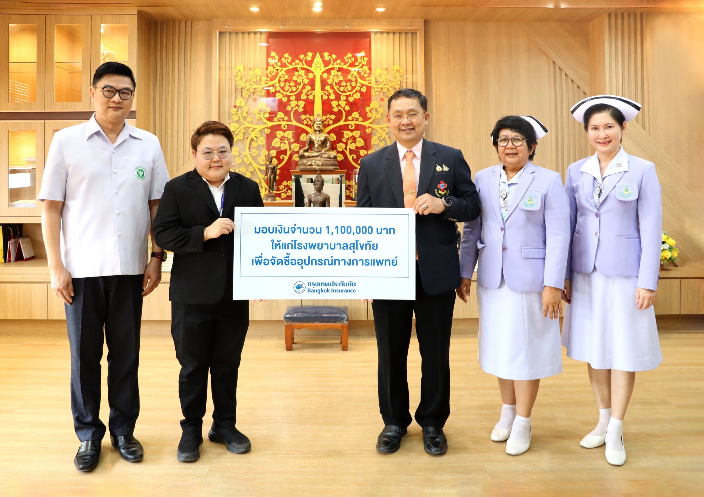 นางสาวสุกัญญา ดอนดง (ที่ 2 จากซ้าย) ผู้จัดการสาขาแม่สอด บริษัท กรุงเทพประกันภัย จำกัด (มหาชน) เป็นผู้แทนบริษัทฯ มอบเงินจำนวน 1,100,000 บาท ให้แก่โรงพยาบาลสุโขทัย โดยมีนายแพทย์สุนทร อินทพิบูลย์ (ที่ 3 จากขวา) ผู้อำนวยการ โรงพยาบาลสุโขทัย เป็นผู้รับมอบ และมีบุคลากรทางการแพทย์ร่วมรับมอบ เพื่อจัดซื้อเครื่องมืออุปกรณ์ทางการแพทย์ที่จำเป็นสำหรับการดูแลรักษาคนไข้ที่ป่วยด้วยโรคที่มีความซับซ้อนในการรักษา ได้แก่ เครื่องตรวจอวัยวะภายในด้วยคลื่นเสียงความถี่สูง เครื่องกระตุ้นกล้ามเนื้อด้วยไฟฟ้าพร้อมอัลตร้าซาวด์ และเครื่องติดคลื่นไฟฟ้าหัวใจพร้อมระบบวิเคราะห์ผล ทั้งนี้ เพื่อให้เพียงพอต่อการรักษาผู้ป่วยในพื้นที่จังหวัดสุโขทัยและจังหวัดใกล้เคียงได้อย่างมีประสิทธิภาพและเกิดประโยชน์สูงสุด ณ โรงพยาบาลสุโขทัย จังหวัดสุโขทัย เมื่อวันที่ 4 กุมภาพันธ์ 2568