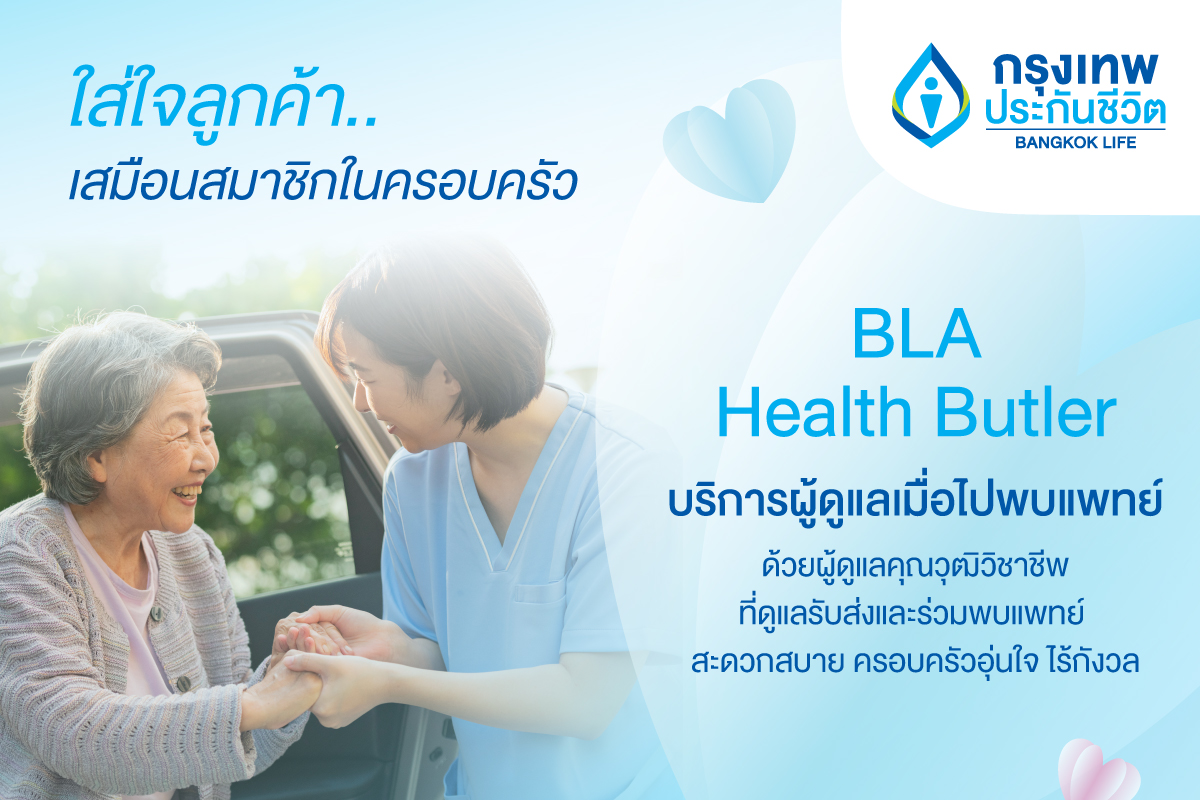 กรุงเทพประกันชีวิต เปิดตัวบริการเสริมด้านสุขภาพ “BLA Health Butler” “ใส่ใจ” พาลูกค้าผู้สูงอายุไปพบแพทย์ที่โรงพยาบาล ด้วยทีมงาน VNurse Care ผู้เชี่ยวชาญที่ให้บริการรับ – ส่งและดูแลตั้งแต่ต้นจนจบ อุ่นใจด้วยการดูแลที่เปรียบเสมือนคนในครอบครัว มอบสิทธิ์แก่ลูกค้าที่มีอายุ 65 ปีขึ้นไป ติดต่อรับบริการได้แล้ววันนี้ โดยกดรับสิทธิ์ผ่านแอปพลิเคชั่น BLA Happy Life ถึงสิ้นปี 2568